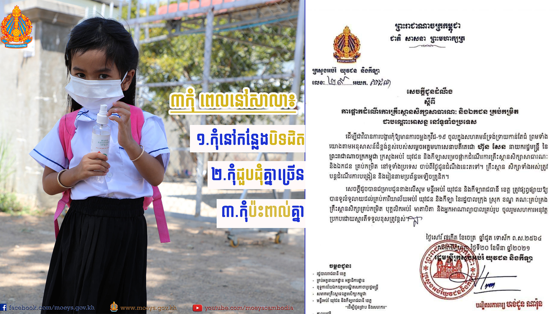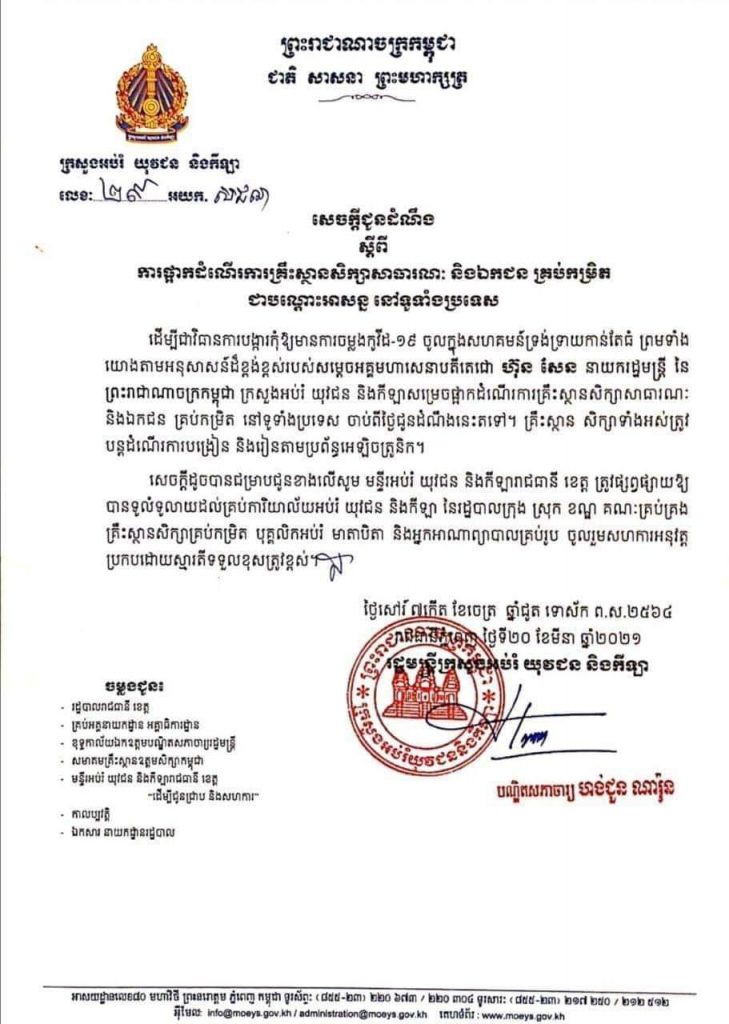 គ្រឹះស្ថានសិក្សាសាធារណៈ និងឯកជន គ្រប់កម្រិត នឹងត្រូវផ្អាកជាបណ្ដោះអាសន្ន នៅទូទាំងប្រទេស នេះបើយោងតាមសេចក្ដីជូនដំណឹង ស្ដីពីការផ្អាកដំណើរការចុះថ្ងៃទី២០ មីនា ឆ្នាំ២០២១ របស់ក្រសួងអប់រំ យុវជន និងកីឡា។ ចំណាត់ការនេះ គឺដើម្បីបង្ការកុំឱ្យមានការចម្លងវីរុសកូវីដ-១៩ ចូលសហគមន៍កាន់តែធំ៕
