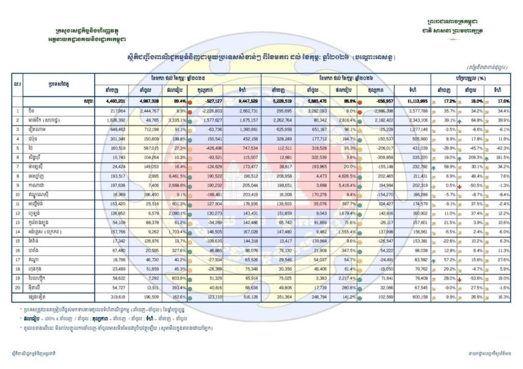 ក្នុងរយៈពេល២ខែ ឆ្នាំ២០២៦ កម្ពុជាបាននាំចេញទំនិញ ក្នុងតម្លៃជាង ៥,២២៨លានដុល្លារ កើនឡើង១៧.២%។ ចំណែកការនាំចូលទំនិញមកវិញមានតម្លៃ ៥,៨៨៥លានដុល្លារ កើនឡើង១៨.០% បើធៀបនឹងរយៈពេលដូចគ្នា កាលឆ្នាំ២០២៥។