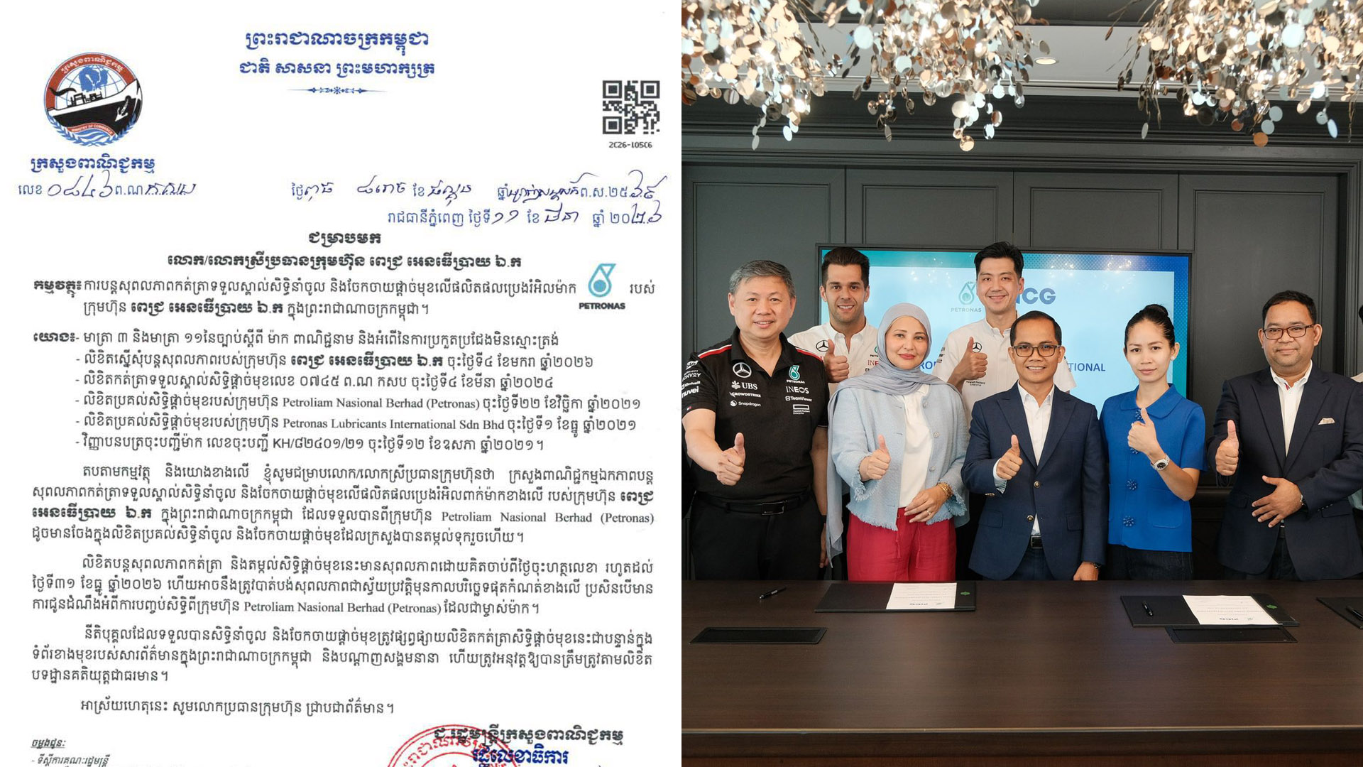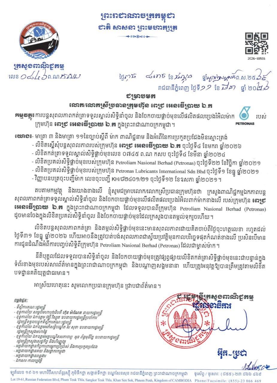 ក្រុមហ៊ុន ពេជ្រ អេនធើប្រាយ ឯ.ក (PIC Enterprise Co.,ltd) ទទួលបានការបន្តសុពលភាពកត់ត្រាសិទ្ធិនាំចូល និងចែកចាយផ្តាច់មុខលើផលិតផលប្រេងម៉ាក PETRONAS ក្នុងព្រះរាជាណាចក្រកម្ពុជា ដោយស្របច្បាប់តែមួយគត់ ហើយមានផេកផ្លូវការរបស់ក្រុមហ៊ុនតែមួយគត់ដូចគ្នាគឺ PETRONAS Lubricants Cambodia។ នេះបើតាមលិខិតរបស់ក្រសួងពាណិជ្ជកម្ម ចុះថ្ងៃទី១១ ខែមីនា ឆ្នាំ២០២៦។