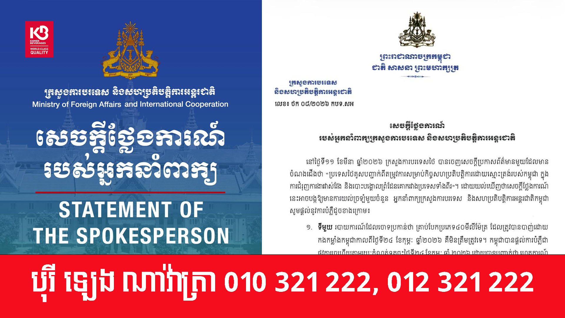 ៤. ជាចុងក្រោយ កម្ពុជានៅតែប្តេជ្ញាចិត្តយ៉ាងពេញលេញចំពោះដំណោះស្រាយបញ្ហាព្រំដែនដោយ សន្តិវិធីដោយផ្អែកលើច្បាប់អន្តរជាតិ និងកិច្ចព្រមព្រៀងទ្វេភាគីដែលមានស្រាប់ ហើយផ្តល់សារៈសំខាន់យ៉ាងខ្លាំងចំពោះការអនុវត្តពេញលេញនៃសេចក្តីប្រកាសរួមនៃកិច្ចប្រជុំពិសេសលើកទី៣ របស់គណៈកម្មាធិការព្រំដែនទូទៅ ថ្ងៃទី២៧ ខែធ្នូ ឆ្នាំ២០២៥។ កម្ពុជាសង្ឃឹមថានឹងឃើញកិច្ចសហប្រតិបត្តិការប្រកបដោយភាពស្មោះត្រង់ ដែលឆ្លុះបញ្ចាំងតាមរយៈសកម្មភាពជាក់ស្ដែង៕