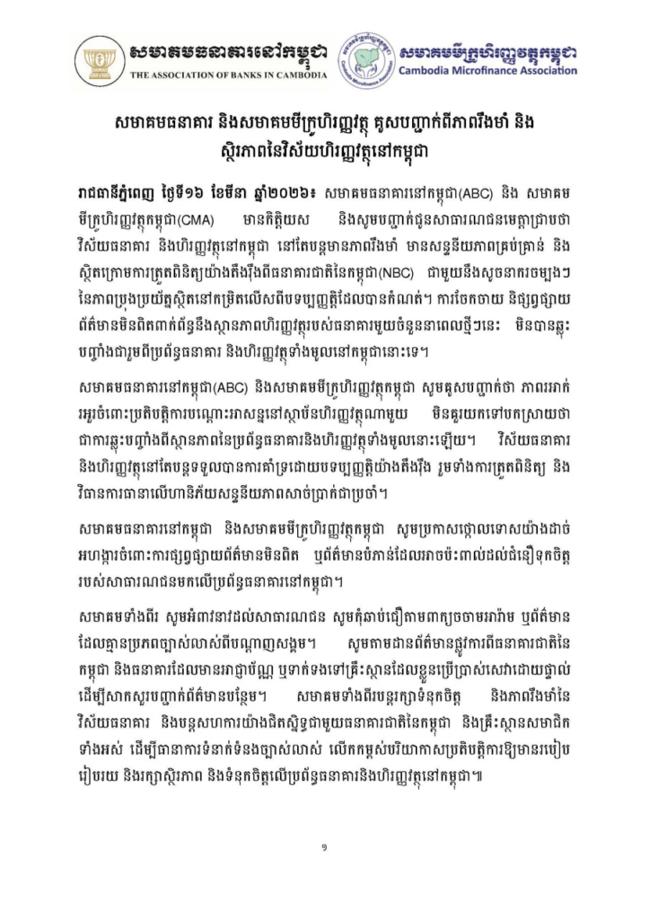 តាមរយៈសេចក្ដីថ្លែងការណ៍ ចុះថ្ងៃទី១៦ ខែមីនា ឆ្នាំ២០២៦ សមាគមទាំងពីរបានលើកឡើងថា ការចែកចាយ និងផ្សព្វផ្សាយព័ត៌មានមិនពិតពាក់ព័ន្ធនឹងស្ថានភាពហិរញ្ញវត្ថុរបស់ធនាគារមួយចំនួននាពេលថ្មីៗនេះ មិនបានឆ្លុះបញ្ចាំងជារួមពីប្រព័ន្ធធនាគារ និងហិរញ្ញវត្ថុទាំងមូលនៅកម្ពុជានោះទេ។