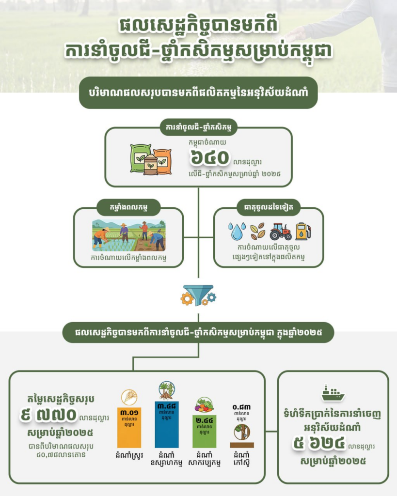 តាមរបាយការណ៍ក្រសួងកសិកម្ម បានបង្ហាញថា ផលសេដ្ឋកិច្ចបានមកពីការនាំចូលជី-ថ្នាំកសិកម្មសម្រាប់កម្ពុជា ក្នុងឆ្នាំ២០២៥ រួមមានទៅលើដំណាំស្រូវ, ដំណាំឧស្សាហកម្ម, ដំណាំសាកវប្បកម្ម និងដំណាំកៅស៊ូ ក្នុងបរិមាណ ៤០,៧៨តោន៕