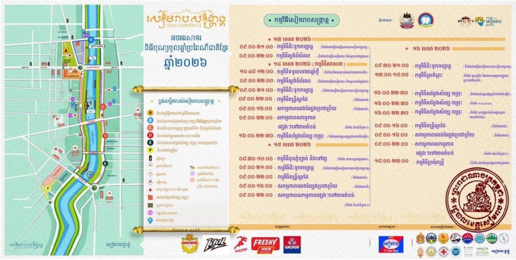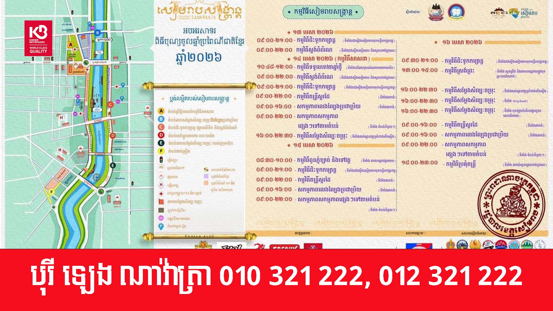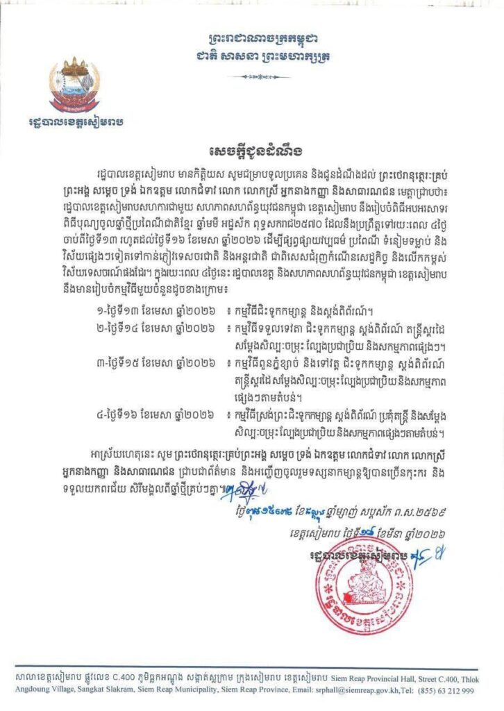 (សៀមរាប)៖ រដ្ឋបាលខេត្តសៀមរាប បានសហការជាមួយ សហភាពសហព័ន្ធយុវជនកម្ពុជាខេត្តសៀមរាប នឹងរៀបចំពិធីអបអរសាទរ ពិធីបុណ្យចូលឆ្នាំថ្មីប្រពៃណីជាតិខ្មែរ ដែលនឹងប្រព្រឹត្តទៅរយៈពេល ៤ថ្ងៃ ចាប់ពីថ្ងៃទី១៣ រហូតដល់ថ្ងៃទី១៦ ខែមេសា ឆ្នាំ២០២៦ ដើម្បីផ្សព្វផ្សាយវប្បធម៌ ប្រពៃណី ទំនៀមទម្លាប់ និង វិស័យផ្សេងៗទៀតទៅកាន់ភ្ញៀវទេសចរជាតិ និងអន្តរជាតិ ជាពិសេសជំរុញកំណើនសេដ្ឋកិច្ច និងលើកកម្ពស់ វិស័យទេសចរណ៍ផងដែរ។
