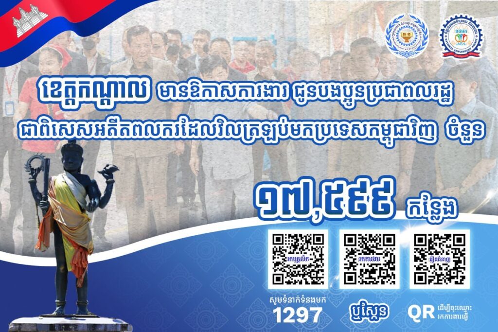 តាមរយៈការផ្សព្វផ្សាយ ក្រសួងការងារបានឱ្យដឹងថា គិតត្រឹមថ្ងៃទី២១ ខែមីនា ឆ្នាំ២០២៦នេះ រាជធានីភ្នំពេញមានឱកាសការងារចំនួន ២១,៩៥៥កន្លែង កំពុងរង់ចាំបងប្អូនអតីតពលករត្រឡប់មកពីប្រទេសថៃ និងអ្នកកំពុងស្វែងរកការងារធ្វើ។ ឱកាសការងារទាំងនោះស្ថិតក្នុងវិស័យឧស្សាហកម្ម កសិកម្ម និងសេវាកម្ម។