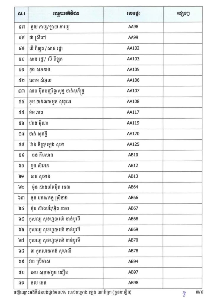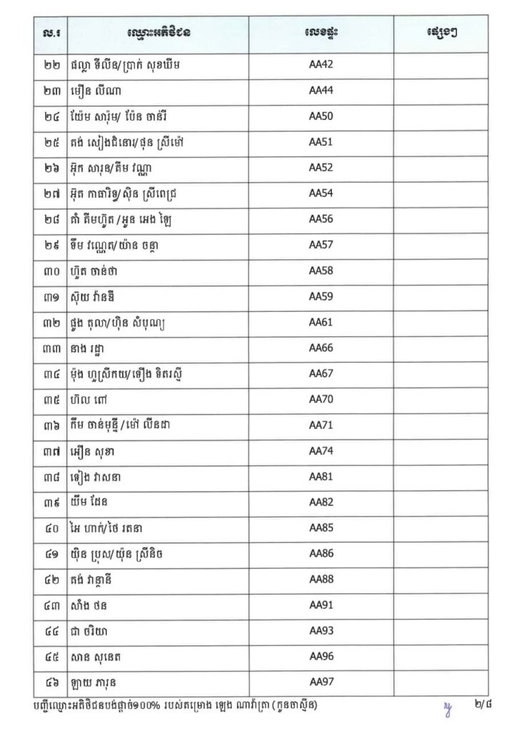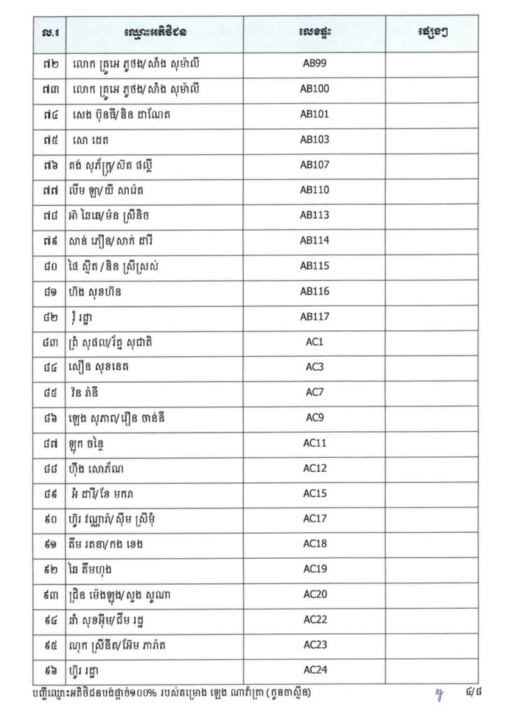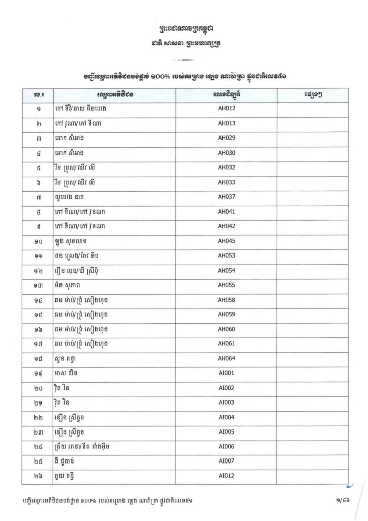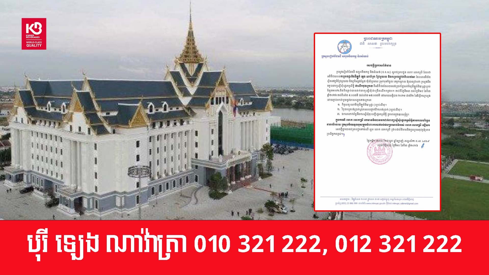 ក្រសួងរៀបចំដែនដី នគរូបនីយកម្ម និងសំណង់ នៅថ្ងៃទី២៣ ខែមីនា ឆ្នាំ២០២៦នេះ បានចេញសេចក្តីប្រកាសព័ត៌មាន ជម្រាបជូនអតិថិជនទាំងអស់របស់គម្រោង ឡេង ណាវ៉ាត្រា ផ្លូវជាតិលេខ៥១ ដែលមានទីតាំងស្ថិតនៅភូមិស្លុកស្លាត និងភូមិត្រពាំង ពោធ៍ ឃុំភ្នំតូច ស្រុកសាមគ្គីមុនីជ័យ ខេត្តកំពង់ស្ពឺ និងគម្រោង ឡេង ណាវ៉ាត្រា (Jasmine) ដែលស្ថិតនៅភូមិត្រពាំងស្លា ឃុំព្រះនិព្វាន ស្រុកគងពិសី ខេត្តកំពង់ស្ពឺ ឲ្យជ្រាបថាក្រសួងនឹងបន្តទទួលពាក្យស្នើរសុំផ្ទេរកម្មសិទ្ធ អតិថិជនដែលបង់ប្រាក់ថ្លៃលក់ទិញដីឡូត៍និងផ្ទះគ្រប់ចំនួន ១០០%។