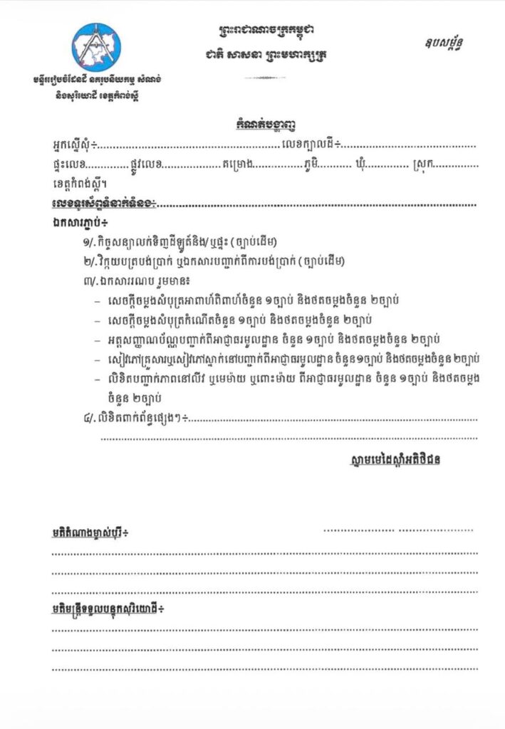 ៣.ឯកសារពាក់ព័ន្ធនឹងការស្នើសុំចុះបញ្ជីផ្ទេរកម្មសិទ្ធិ ដូចមានក្នុងឧបសម្ព័ន្ធ។