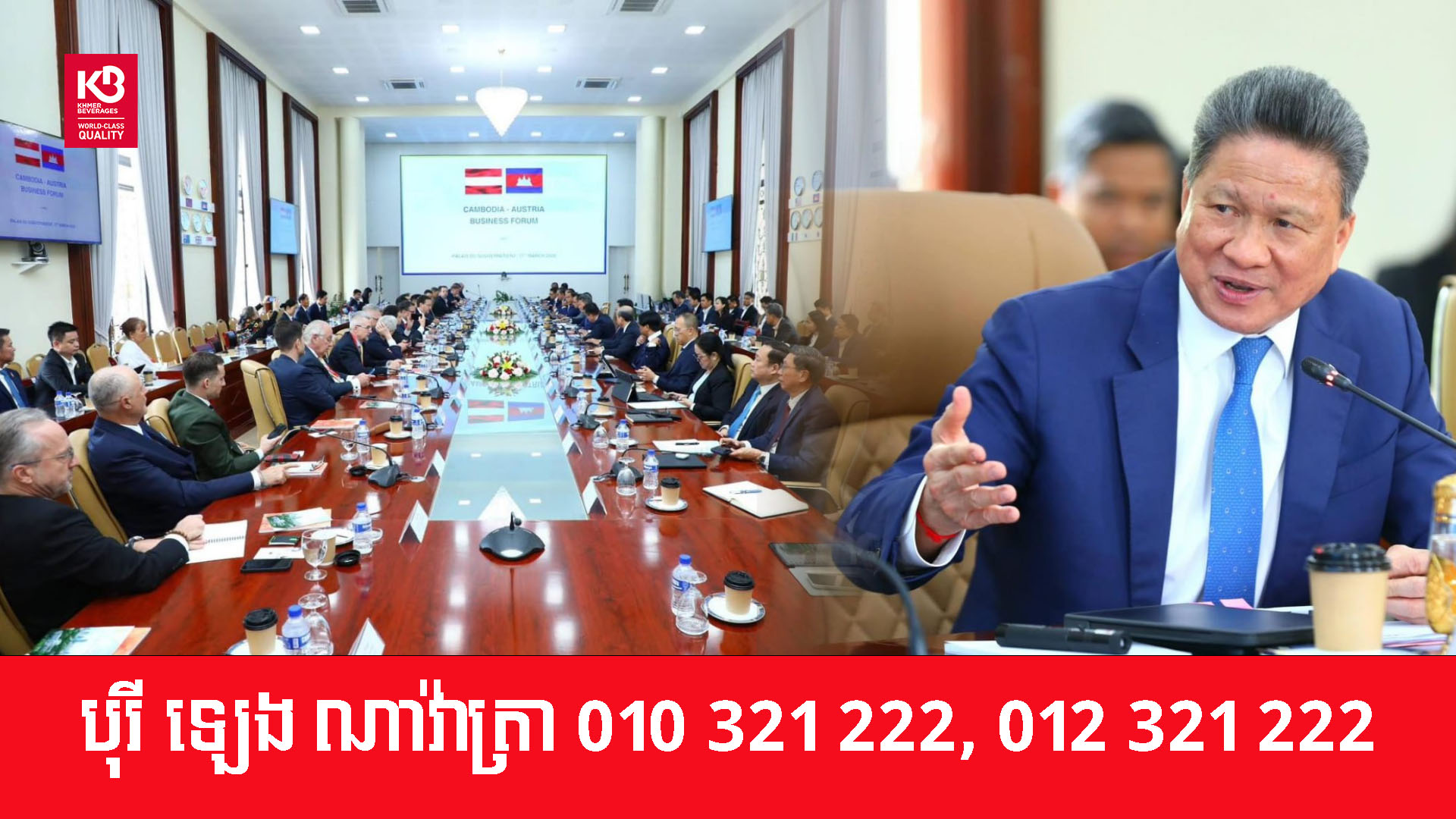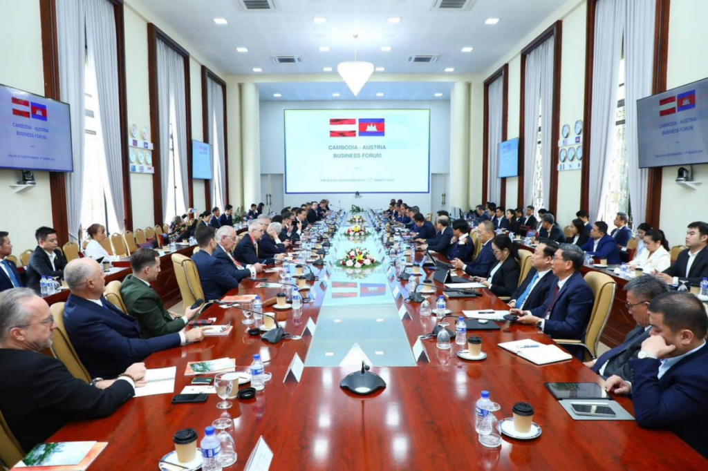 សហគ្រាសធំៗចំនួន ១៩ ដែលមកពីសាធារណរដ្ឋអូទ្រីស បានអញ្ជើញចូលរួមជាវាគ្មិនក្នុងវេទិកាធុរកិច្ចកម្ពុជា-អូទ្រីស ដែលរៀបចំនាព្រឹកថ្ងៃទី១៧ ខែមីនា ឆ្នាំ២០២៦ ក្រោមអធិបតីភាពរបស់ឯកឧត្តម ស៊ុន ចាន់ថុល ឧបនាយករដ្ឋមន្ត្រី អនុប្រធានទី១ នៃក.អ.ក និងលោក Andreas Sumper អនុប្រធានបេសកកម្មនៃស្ថានទូតអូទ្រីសប្រចាំកម្ពុជា ដោយមានវត្តមានចូលរួមពីតំណាងក្រសួង ស្ថាប័នរដ្ឋ និងឯកជននៃភាគីទាំងពីរ ប្រមាណ ៦០ រូប។