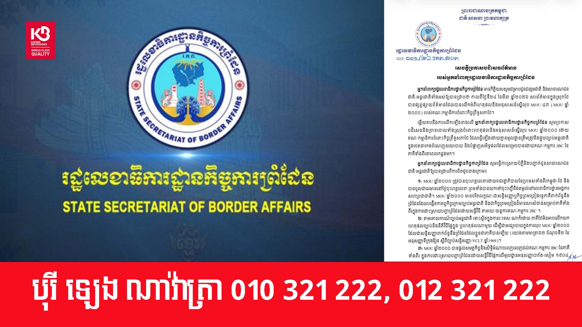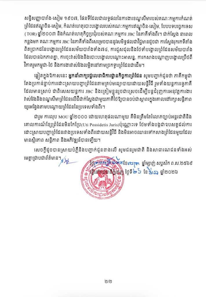 ក្នុងសេចក្ដីប្រកាសព័ត៌មានថ្ងៃទី២៦ ខែមីនា ឆ្នាំ២០២៦នេះ អ្នកនាំពាក្យរដ្ឋលេខាធិការដ្ឋានកិច្ចការព្រំដែនកម្ពុជាបានបញ្ជាក់ថា អនុស្សរណៈយោគយល់គ្នាលើការបោះបង្គោលព្រំដែនគោកកម្ពុជា-ថៃ MOU 2000 ត្រូវបានកម្ពុជា និងថៃចុះហត្ថលេខា ព្រមទាំងយកទៅតម្កល់នៅលេខាធិការដ្ឋានអង្គការសហប្រជាជាតិរួចរាល់ ដែលបង្កើតកាតព្វកិច្ចក្រោមច្បាប់អន្តរជាតិ និងជាកិច្ចព្រមព្រៀងដ៏មានសារសំខាន់សម្រាប់ដោះស្រាយបញ្ហាព្រំដែនដោយសន្ដិវិធី។ ថៃមិនអាចយកហេតុផលនិងនីតិវិធីផ្ទៃក្នុង ឬហេតុផលណាមួយដើម្បីលុប MOU នេះទេ។