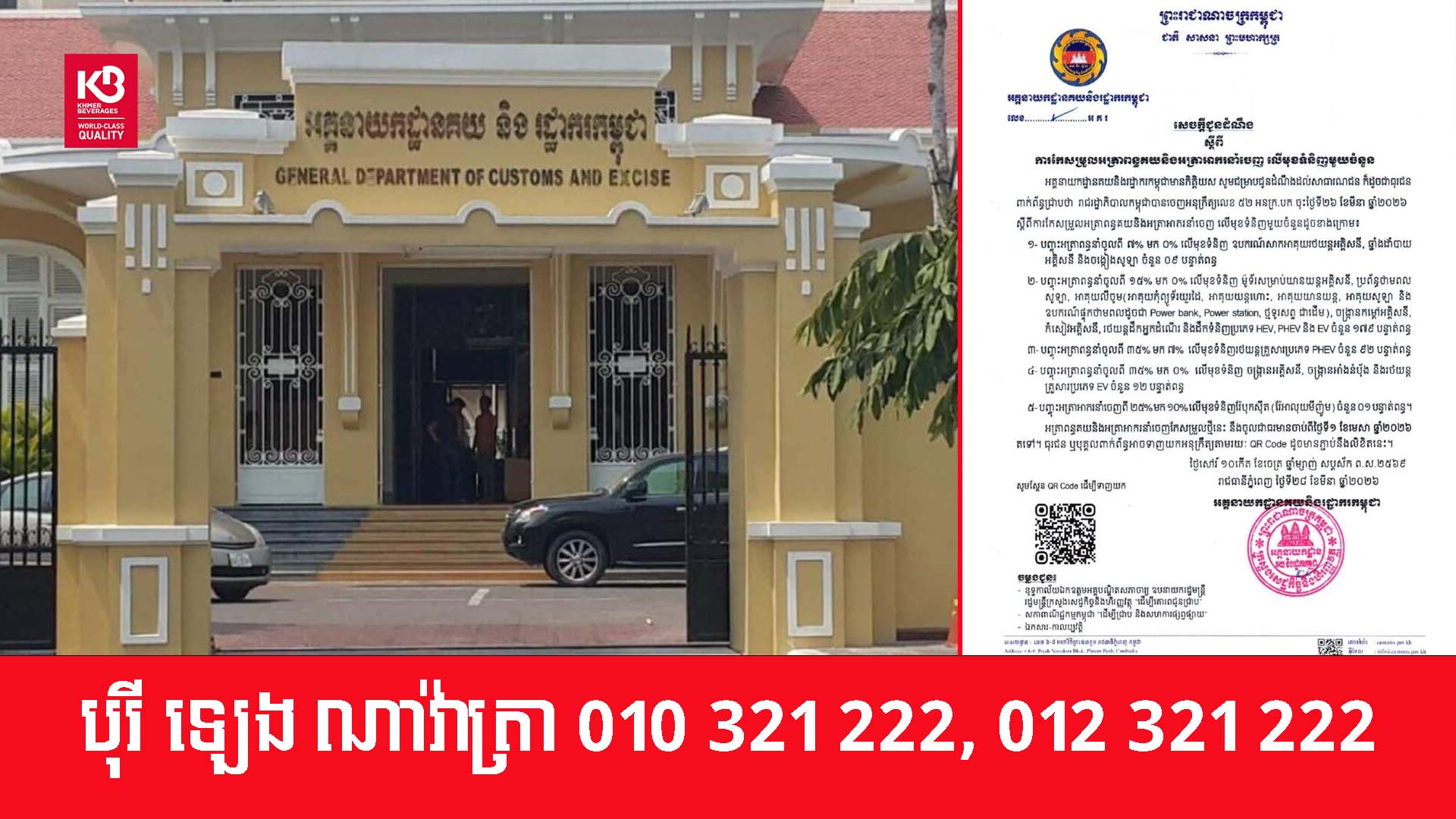 (ភ្នំពេញ)៖ យោងតាមអគ្គនាយកដ្ឋានគយនិងរដ្ឋករកម្ពុជា បានឱ្យដឹងថា រាជរដ្ឋាភិបាលកម្ពុជាបានចេញអនុក្រឹត្យលេខ ៥២ អនក្រ.បក ចុះថ្ងៃទី២៦ ខែមីនា ឆ្នាំ២០២៦ ស្តីពីការកែសម្រួលអត្រាពន្ធគយនិងអត្រាអាករនាំចេញ លើមុខទំនិញមួយចំនួនដូចខាងក្រោម៖