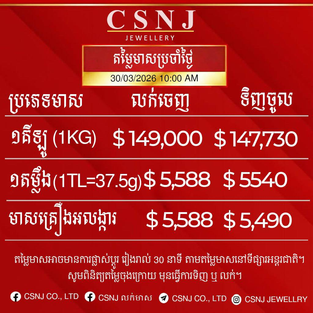 សម្រាប់តម្លៃក្នុង១តម្លឹង គឺមានតម្លៃ ៥,៥៨៨ដុល្លារ ជាតម្លៃលក់ចេញ និងទិញចូលក្នុងតម្លៃ ៥,៥៤០ដុល្លារ។ ដោយឡែកសម្រាប់មាសគ្រឿងអលង្ការ មានតម្លៃ ៥,៥៨៨ដុល្លារ ជាតម្លៃលក់ចេញ និងទិញចូលក្នុងតម្លៃ ៥,៤៩០ដុល្លារ។ នេះបើយោងតាមហាងឆេងមាស ពីហាងមាសពេជ្រ CSNJ របស់លោកឧកញ៉ា ចិន សំណាង នាព្រឹក ម៉ោង១០:០០ នាទី ថ្ងៃទី៣០ ខែមីនានេះ។