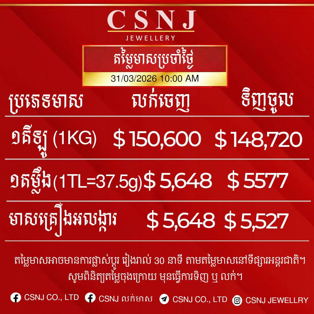 តម្លៃមាសនៅថ្ងៃទី៣១ ខែមីនា ឆ្នាំ២០២៦នេះ សម្រាប់មាសគីឡូ មានតម្លៃ ១៥០,៦០០ដុល្លារ នៅក្នុងមួយគីឡូជាតម្លៃលក់ចេញ និងទិញចូលក្នុងតម្លៃ ១៤៨,៧២០ដុល្លារ។
