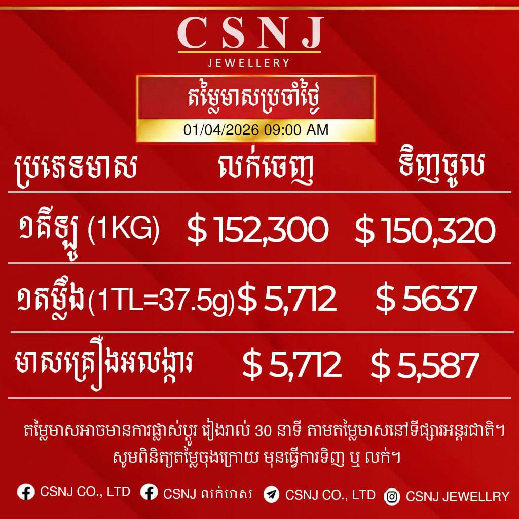 តម្លៃមាសនៅថ្ងៃទី១ ខែមេសា ឆ្នាំ២០២៦នេះ សម្រាប់មាសគីឡូ មានតម្លៃ ១៥២,៣០០ដុល្លារ នៅក្នុងមួយគីឡូជាតម្លៃលក់ចេញ និងទិញចូលក្នុងតម្លៃ ១៥០,៣២០ដុល្លារ។