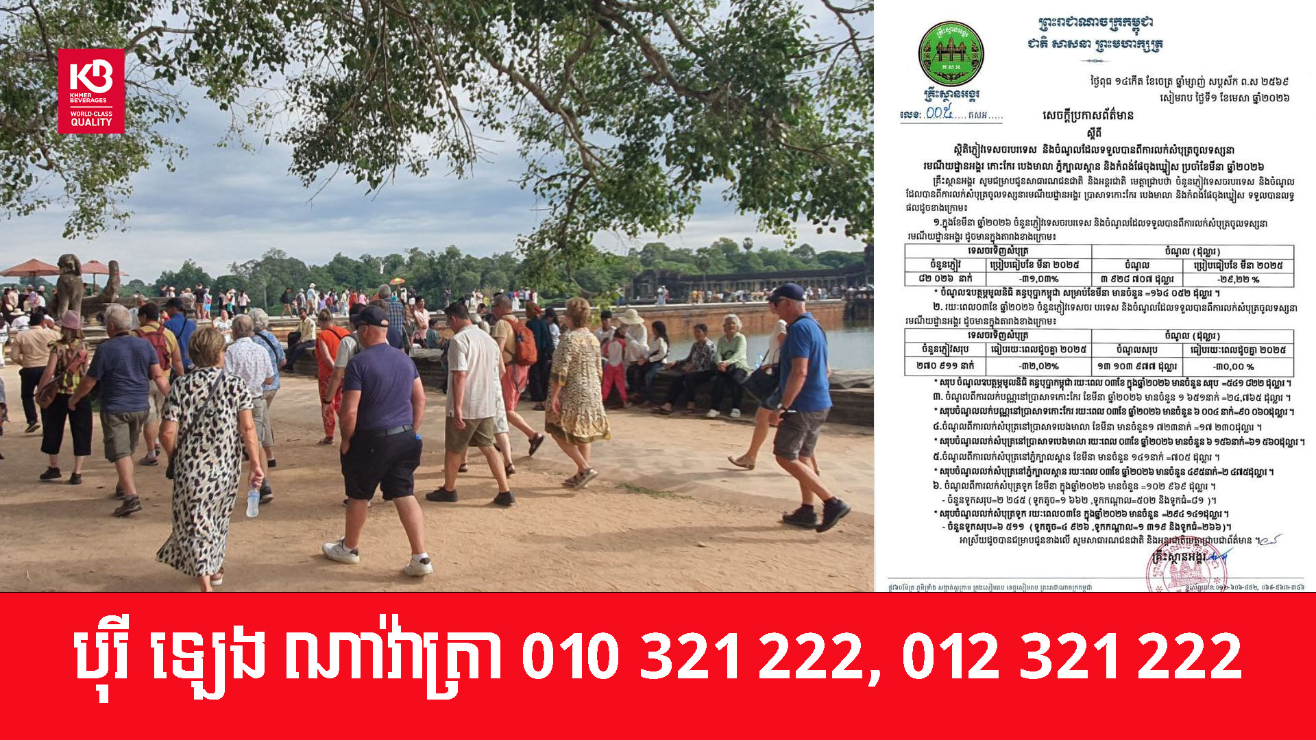 ចាប់ពីខែមករា-ដល់ដំណាច់ខែមីនា ឆ្នាំ២០២៦ មានភ្ញៀវទេសចរអន្តរជាតិ ២៧០ ៩១១ នាក់បានទិញសំបុត្រចូលទស្សនារមណីយដ្ឋានអង្គរ ដោយគិតជាទឹកប្រាក់ដែលបានពីការលក់សំបុត្រមានចំនួន ១៣,១ លានដុល្លារ ថយចុះ ៣០%។នេះសេចក្តីប្រកាសព័ត៌មានរបស់គ្រឹះស្ថានអង្គរ ចេញផ្សាយក្នុងថ្ងៃទី១ ខែមេសា ឆ្នាំ២០២៦។