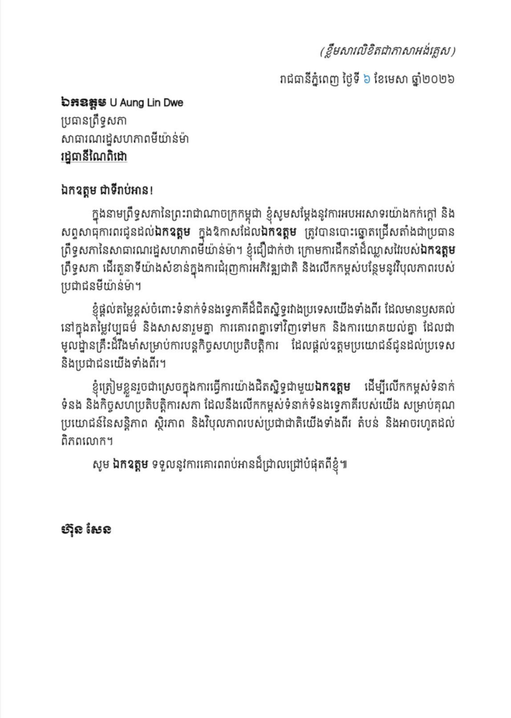 យោងតាមសារលិខិត ដែលផ្សាយចេញនៅថ្ងៃទី ៦ ខែមេសា ឆ្នាំ២០២៦ សម្តេចតេជោ ហ៊ុន សែន ប្រធានព្រឹទ្ធសភានៃព្រះរាជាណាចក្រកម្ពុជា បានអបអរសាទរជូនដល់លោក U Aung Lin Dwe ម ក្នុងឱកាសដែលលោក ត្រូវបានបោះឆ្នោតជ្រើសតាំងជាប្រធាន ព្រឹទ្ធសភានៃសាធារណរដ្ឋសហភាពមីយ៉ាន់ម៉ា។ ខ្ញុំជឿជាក់ថា ក្រោមការដឹកនាំដ៏ឈ្លាសវៃរបស់លោក ព្រឹទ្ធសភា ដើរតួនាទីយ៉ាងសំខាន់ក្នុងការជំរុញការអភិវឌ្ឍជាតិ និងលើកកម្ពស់បន្ថែមនូវវិបុលភាពរបស់ ប្រជាជនមីយ៉ាន់ម៉ា។