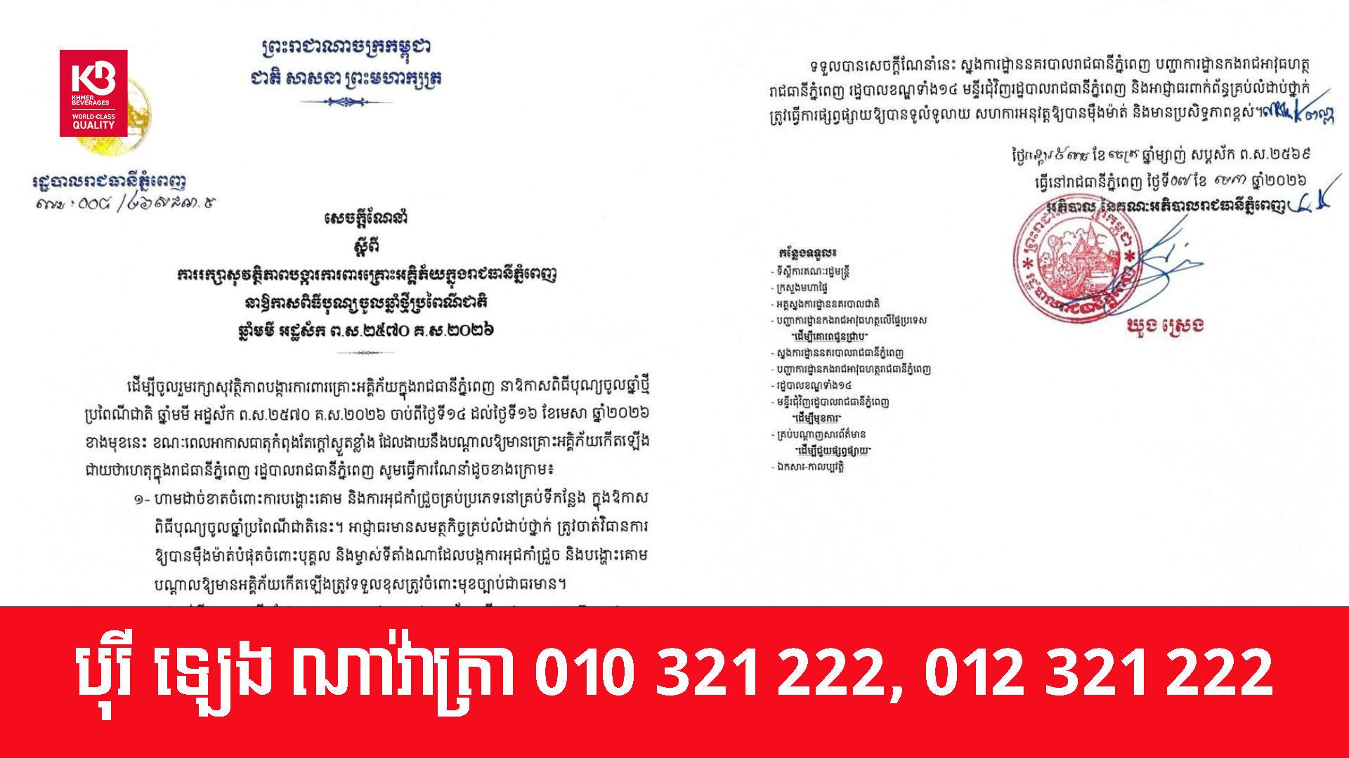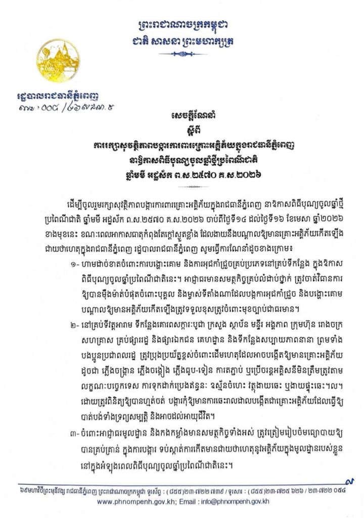 ដើម្បីចូលរួមរក្សាសុវត្ថិភាពបង្ការការពារគ្រោះអគ្គិភ័យក្នុងរាជធានីភ្នំពេញ នាឱកាសពិធីបុណ្យចូលឆ្នាំថ្មី ប្រពៃណីជាតិ ឆ្នាំមមី អដ្ឋស័ក ព.ស.២៥៧០ គ.ស.២០២៦ ចាប់ពីថ្ងៃទី១៤ ដល់ថ្ងៃទី១៦ ខែមេសា ឆ្នាំ២០២៦ ខាងមុខនេះ ខណៈពេលអាកាសធាតុកំពុងតែក្តៅស្ងួតខ្លាំង ដែលងាយនឹងបណ្តាលឱ្យមានគ្រោះអគ្គិភ័យកើតឡើង ជាយថាហេតុក្នុងរាជធានីភ្នំពេញ រដ្ឋបាលរាជធានីភ្នំពេញ បានចេញសេចក្តីណែនាំ៖