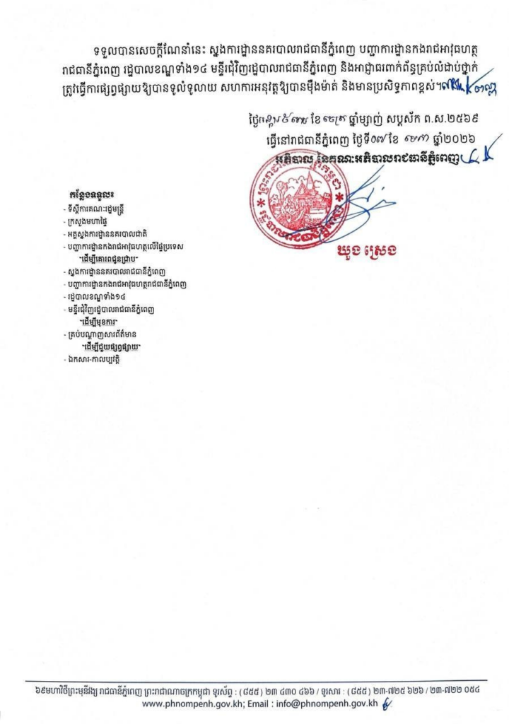 ទទួលបានសេចក្តីណែនាំនេះ ស្នងការដ្ឋាននគរបាលរាជធានីភ្នំពេញ បញ្ជាការដ្ឋានកងរាជអាវុធហត្ថ រាជធានីភ្នំពេញ រដ្ឋបាលខណ្ឌទាំង១៤ មន្ទីរជុំវិញរដ្ឋបាលរាជធានីភ្នំពេញ និងអាជ្ញាធរពាក់ព័ន្ធគ្រប់លំដាប់ថ្នាក់ ត្រូវធ្វើការផ្សព្វផ្សាយឱ្យបានទូលំទូលាយ សហការអនុវត្តឱ្យបានម៉ឺងម៉ាត់ និងមានប្រសិទ្ធភាពខ្ពស់៕