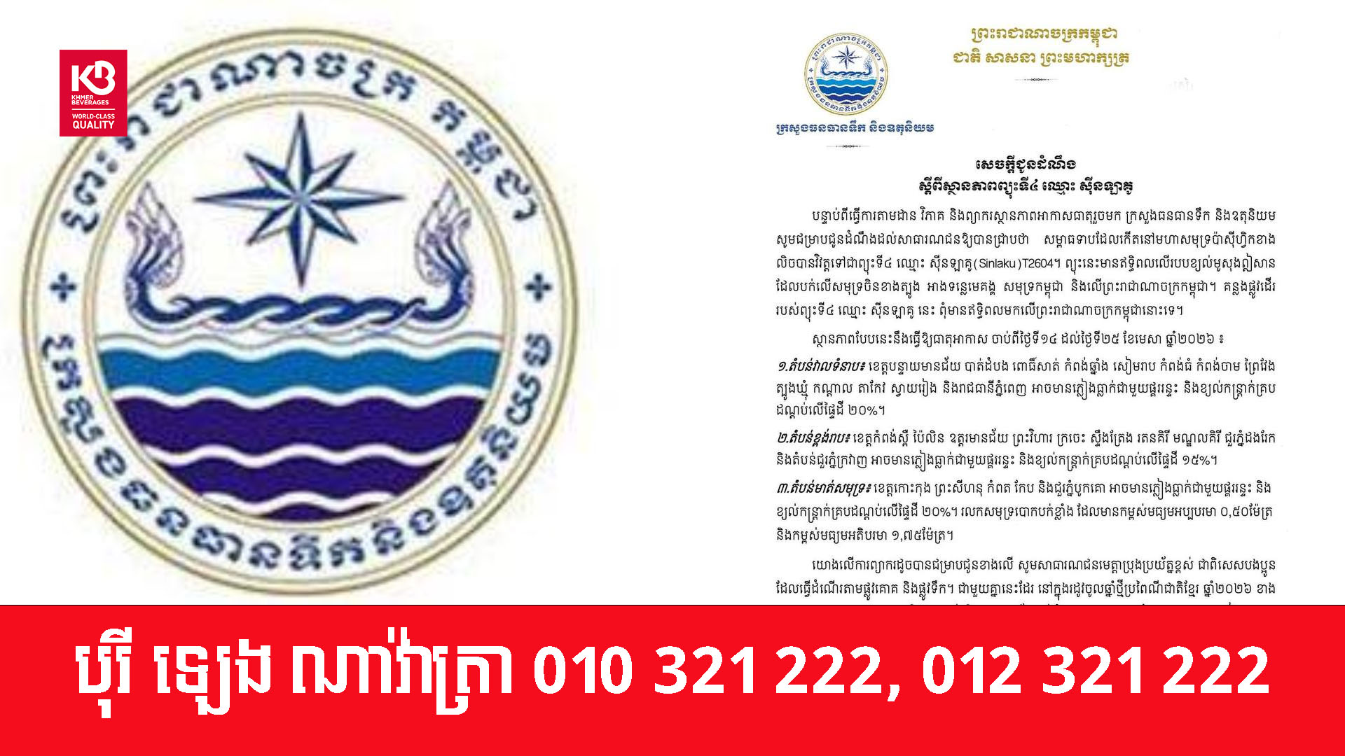 ចាប់ពីថ្ងៃទី១៤ ដល់ថ្ងៃទី២៥ ខែមេសា ឆ្នាំ២០២៦ កម្ពុជានឹងរងសម្ពាធពីព្យុះទី៤ ឈ្មោះ ស៊ីនឡាគូ ដែលអាចមានភ្លៀងធ្លាក់ និងខ្យល់កន្ត្រាក់ នៅតំបន់ចំនួន២។នេះបើតាមសេចក្តីជូនដំណឹងរបស់ក្រសួងធនធានទឹក និងឧតុនិយម ស្តីពីស្ថានភាពព្យុះទី៤ ឈ្មោះ ស៊ីនឡាតូ នៅថ្ងៃទី១០ ខែមេសា​ ឆ្នាំ២០២៦។