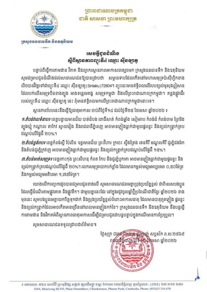 ក្រសួងធនធានទឹក បានប្រកាសដល់សាធារណជនឱ្យបានជ្រាបថា សម្ពាធទាបដែលកើតនៅមហាសមុទ្រប៉ាស៊ីហ្វិកខាង លិចបានវិវត្តទៅជាព្យុះទី៤ ឈ្មោះ ស៊ីនឡាគូ (Sinlaku) T2604។ ព្យុះនេះមានឥទ្ធិពលលើរបបខ្យល់មូសុងឦសាន ដែលបក់លើសមុទ្រចិនខាងត្បូង អាងទន្លេមេគង្គ សមុទ្រកម្ពុជា និងលើព្រះរាជាណាចក្រកម្ពុជា។ គន្លងផ្លូវដើរ របស់ព្យុះទី៤ ឈ្មោះ ស៊ីនឡាគូ នេះ ពុំមានឥទ្ធិពលមកលើព្រះរាជាណាចក្រកម្ពុជានោះទេ។