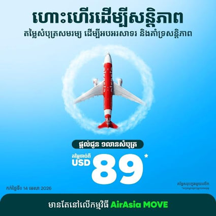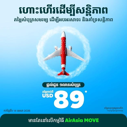 រាជធានីភ្នំពេញ, ថ្ងៃទី១០ ខែមេសា ឆ្នាំ២០២៦ – ក្រុមហ៊ុនអាកាសចរណ៍ AirAsia  បានប្រកាសបើកសម្ពោធ នូវយុទ្ធនាការថ្មីរបស់ខ្លួនក្រោមបរិបទ “ហោះហើរដើម្បីសន្តិភាព​” (Give Peace a Chance) នាថ្ងៃនេះ ដើម្បីបញ្ជាក់ជាថ្មី នូវបេសកកម្មរបស់ក្រុមហ៊ុន ក្នុងការផ្តល់លទ្ធភាពឱ្យទទួលបានការធ្វើដំណើរ តាមផ្លូវអាកាស ប្រកបដោយភាពងាយស្រួល និងមានតម្លៃសមរម្យសម្រាប់មនុស្សគ្រប់រូប និងដើម្បីឆ្លើយតបចំពោះស្ថានភាពមិនច្បាស់ជាសកល ដែលកំពុងបន្តផ្លាស់ប្តូរ របៀបរស់នៅ ការបំពេញការងារ និងការតភ្ជាប់ទំនាក់ទំនងសង្គម។