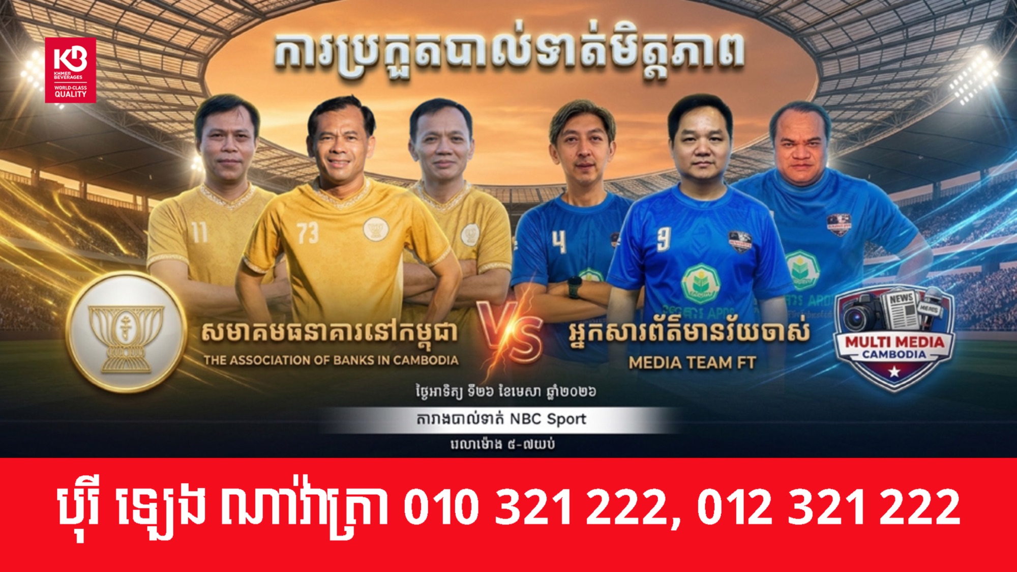 ដើម្បីលើកស្ទួយវិស័យកីឡានៅកម្ពុជា និងរឹតចំណងមិត្តភាពរវាងវិស័យព័ត៌មាន ជាមួយវិស័យធនាគារនៅកម្ពុជា សមាគមធនាគារនៅកម្ពុជា (ABC) បានសហការជាមួយបណ្តាស្ថាប័នព័ត៌មាននានានៅកម្ពុជា រៀបចំការប្រកួតបាល់ទាត់មិត្តភាព ដែលនឹងប្រព្រឹត្តទៅនៅល្ងាចថ្ងៃទី២៦ ខែមេសា ឆ្នាំ២០២៦ខាងមុខ នាតារាបាល់ទាត់ NBC Sports ក្នុងខណ្ឌសែនសុខ រាជធានីភ្នំពេញ។