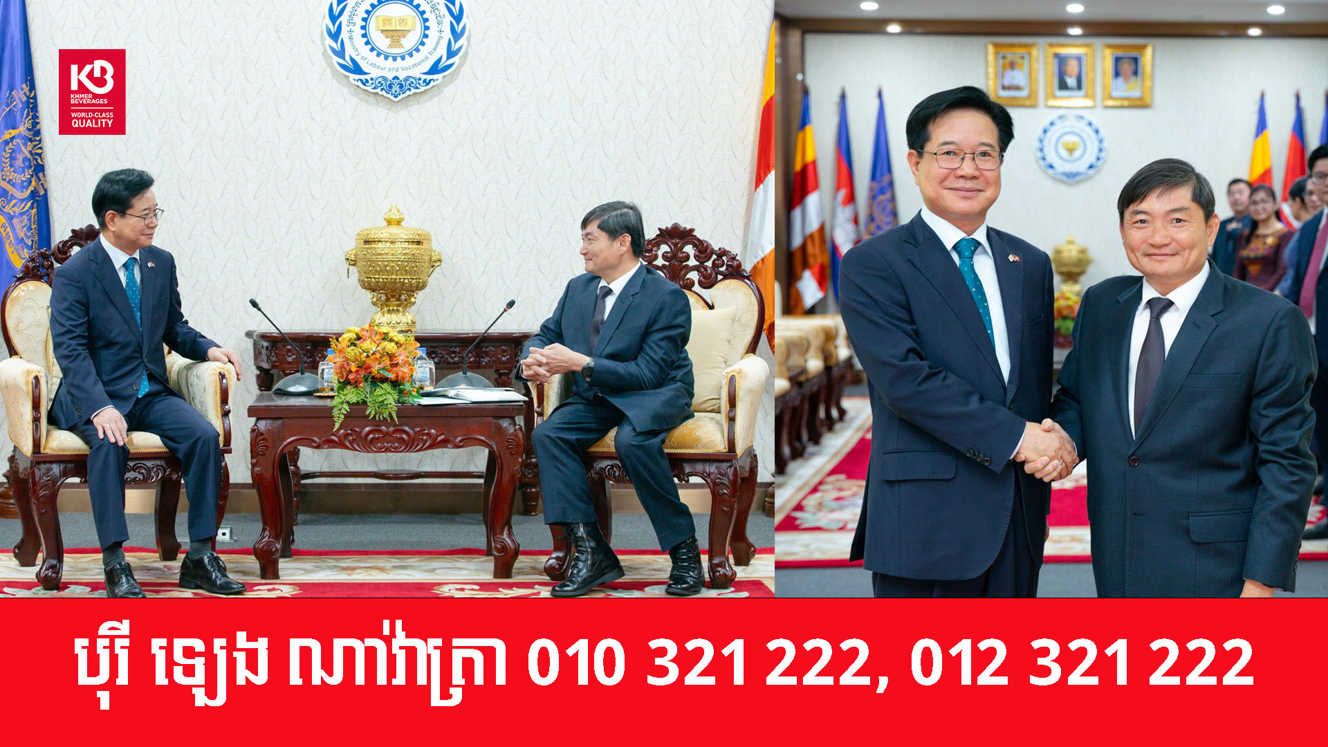 ​ឯកឧត្ដម ហេង សួរ រដ្ឋមន្ត្រីក្រសួងការងារនិងបណ្ដុះបណ្ដាលវិជ្ជាជីវៈ បានទទួលជួបសម្តែងការគួរសម និងពិភាក្សាការងារជាមួយឯកឧត្ដម គីម ឆាងយ៉ុង ឯកអគ្គរដ្ឋទូតថ្មីនៃសាធារណរដ្ឋកូរ៉េប្រចាំកម្ពុជា នៅទីស្តីការក្រសួង នាព្រឹកថ្ងៃទី២១ ខែមេសា ឆ្នាំ២០២៦ ដើម្បីពិភាក្សាពីការលើកកម្ពស់សិទ្ធិពលករ និងពីការស្វែងរកឱកាសបង្កើនកិច្ចសហប្រតិបត្តិការលើការអភិវឌ្ឍធនធានមនុស្ស ការបញ្ជូនកម្លាំងពលកម្ម និងបង្កើតបរិយាកាសកាន់តែប្រសើរដល់អ្នកវិនិយោគ។