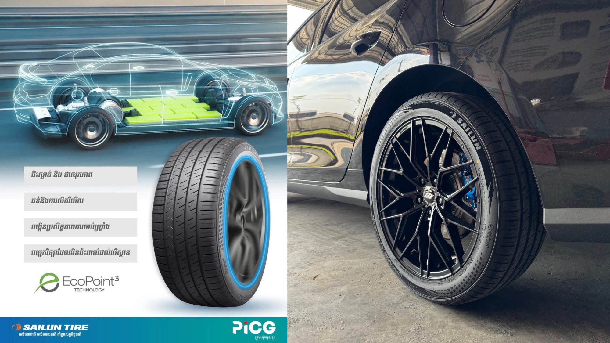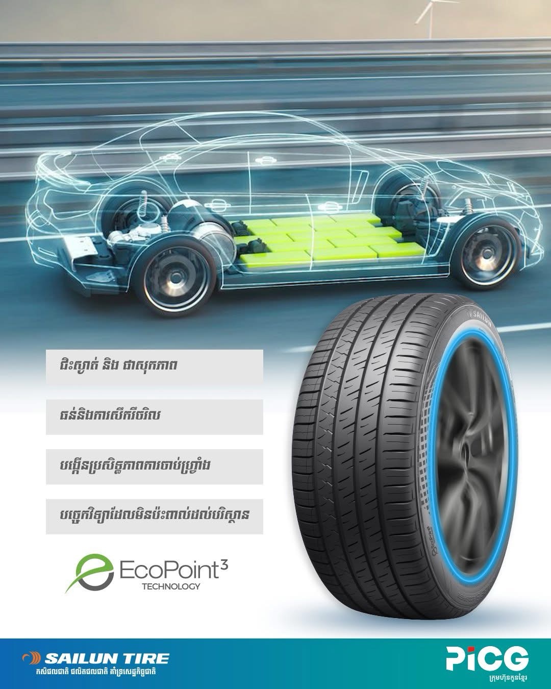 ១. បច្ចេកវិទ្យា EcoPoint3 (បង្កើនចម្ងាយបើកបរ)៖ នេះជាបច្ចេកវិទ្យាដ៏លេចធ្លោបំផុតរបស់ Sailun ដែលជួយឱ្យសំបកកង់មាន កម្លាំងកកិតទាប។ រក្សាថាមពលអាគុយបានល្អជាងសំបកកង់ធម្មតា ដែលជួយឱ្យរថយន្តរបស់អ្នកអាច បើកបរបានចម្ងាយឆ្ងាយជាងមុន ក្នុងកម្រិតសាកថ្មមួយដង។
