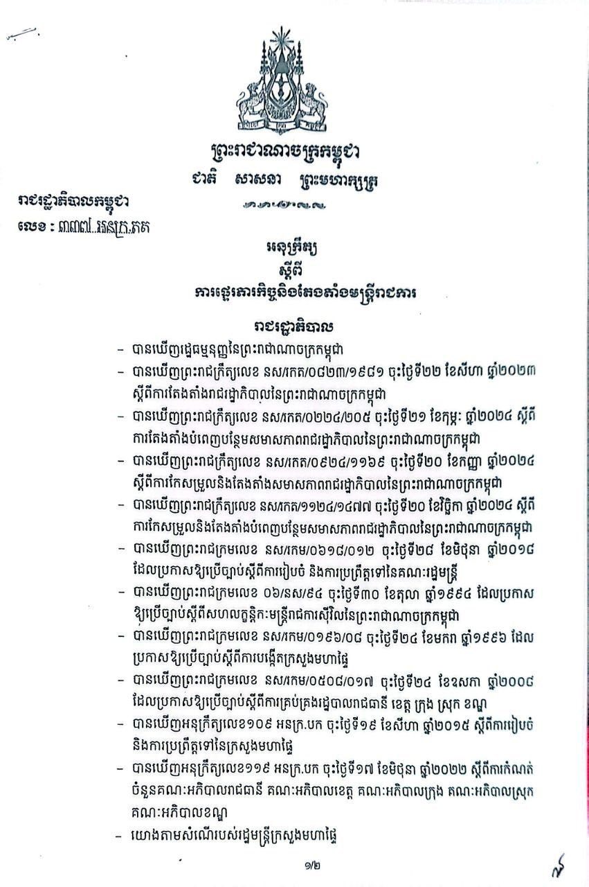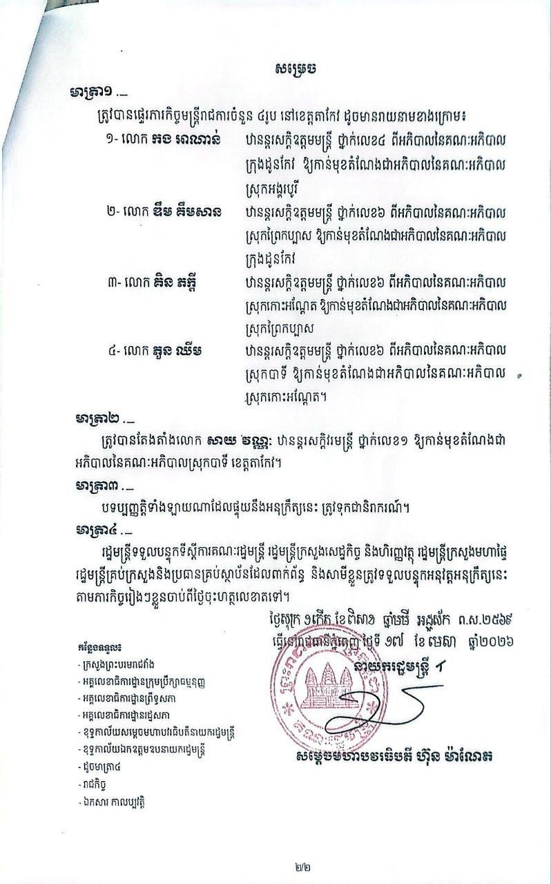 សម្តេចធិបតី ហ៊ុន ម៉ាណែត នាយករដ្ឋមន្ត្រីនៃព្រះរាជាណាចក្រកម្ពុជា នៅថ្ងៃទី១៧ ខែមេសា ឆ្នាំ២០២៦ បានចេញ​អនុក្រឹត្យផ្ទេរភារកិច្ច និងតែងតាំង អភិបាលនៃគណៈអភិបាលក្រុង ស្រុក ចំនួន ៥រូប នៅខេត្តតាកែវ យោងតាមសំណើរបស់រដ្ឋមន្ត្រីក្រសួងមហាផ្ទៃ។