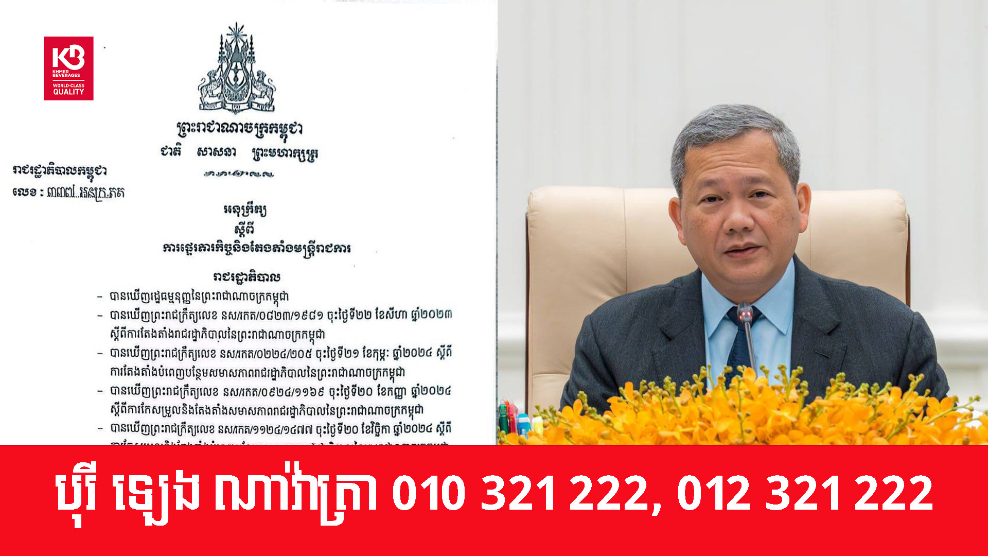 សម្តេចធិបតី ហ៊ុន ម៉ាណែត ចេញអនុក្រឹត្យផ្ទេរភារកិច្ច និងតែងតាំងអភិបាលក្រុង ស្រុក ចំនួន ៥រូប នៅខេត្តតាកែវ