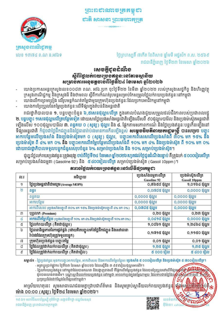 ក្រសួងពាណិជ្ជកម្ម បានបញ្ជាក់ឱ្យដឹងថា ថ្លៃលក់រាយប្រេងឥន្ធនៈត្រូវអនុវត្តចាប់ពីថ្ងៃទី២៤ ខែមេសា ឆ្នាំ២០២៦ រហូតដល់ថ្ងៃជូនដំណឹងបន្ទាប់ គឺមានតម្លៃ៥ ០០០រៀល/លីត្រ សម្រាប់ប្រេងសាំងធម្មតា និង ៥ ៤០០រៀល/លីត្រ សម្រាប់ប្រេងម៉ាស៊ូត។