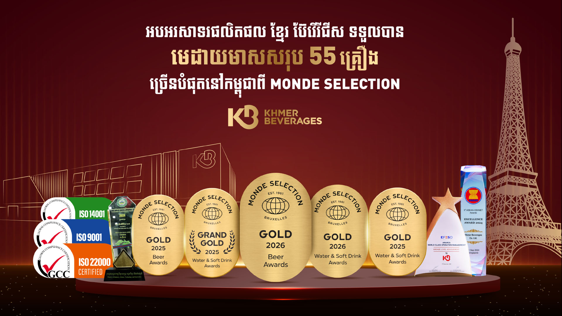 ឆ្នាំ ២០២៦ ខ្មែរ ប៊ែវើរីជីស ទទួលបានមេដាយមាស ១០ គ្រឿងបន្ថែមទៀត ពីស្ថាប័ន Monde Selection ដែលបន្តបញ្ជាក់ពីគុណភាពស្តង់ដារអន្តរជាតិ។
