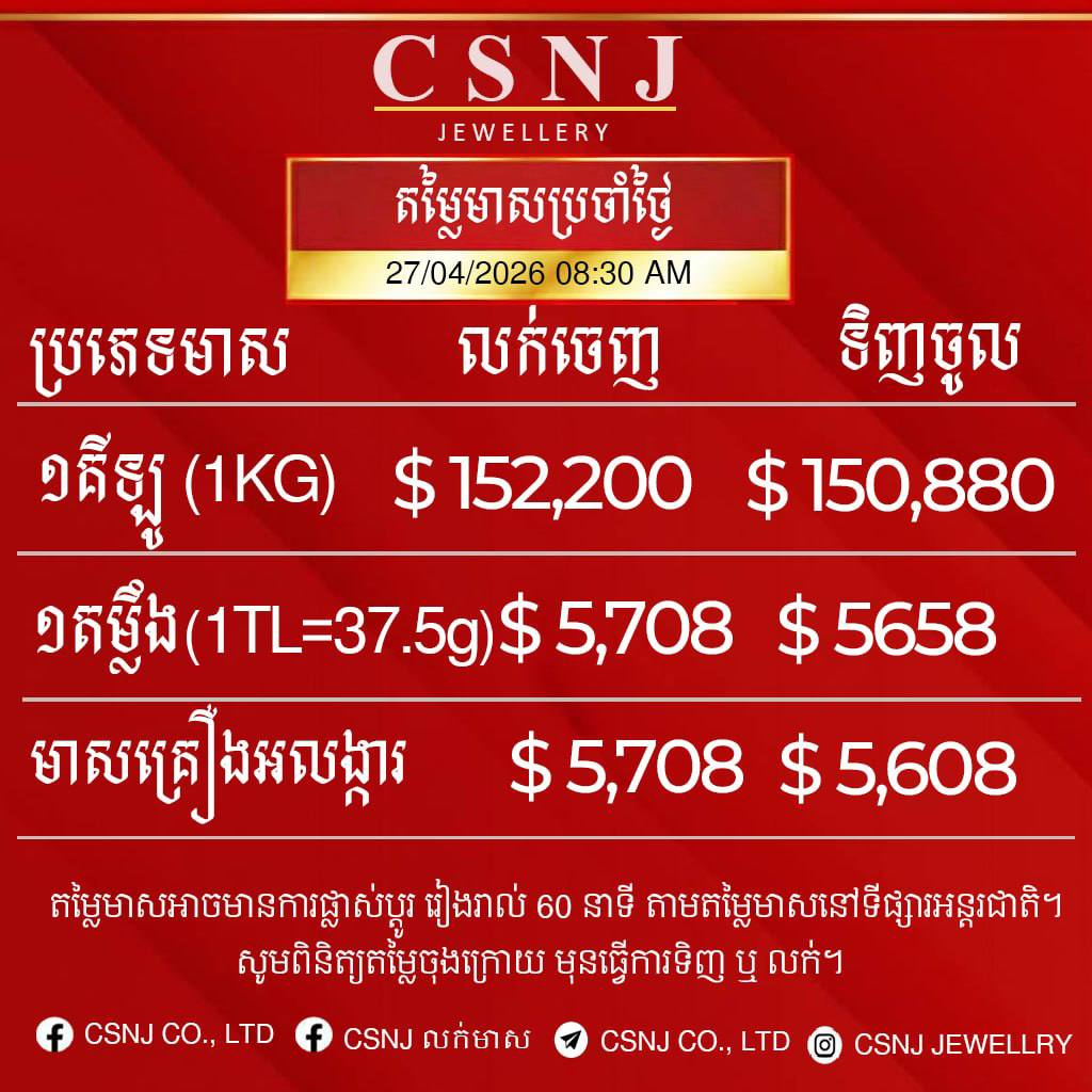 តម្លៃមាសនៅថ្ងៃទី២៧ ខែមេសា ឆ្នាំ២០២៦នេះ សម្រាប់មាសគីឡូ មានតម្លៃ ១៥២,២០០ដុល្លារ នៅក្នុងមួយគីឡូជាតម្លៃលក់ចេញ និងទិញចូលក្នុងតម្លៃ ១៥០,៨៨០ដុល្លារ។