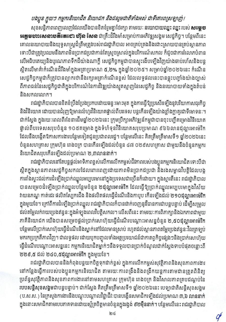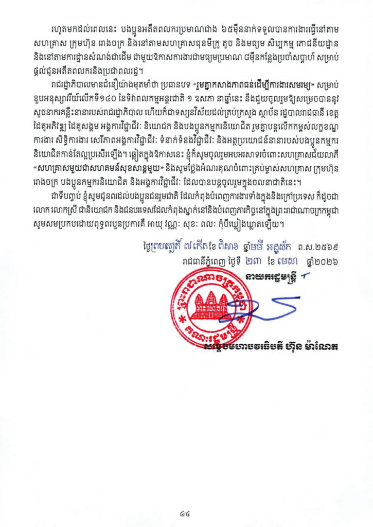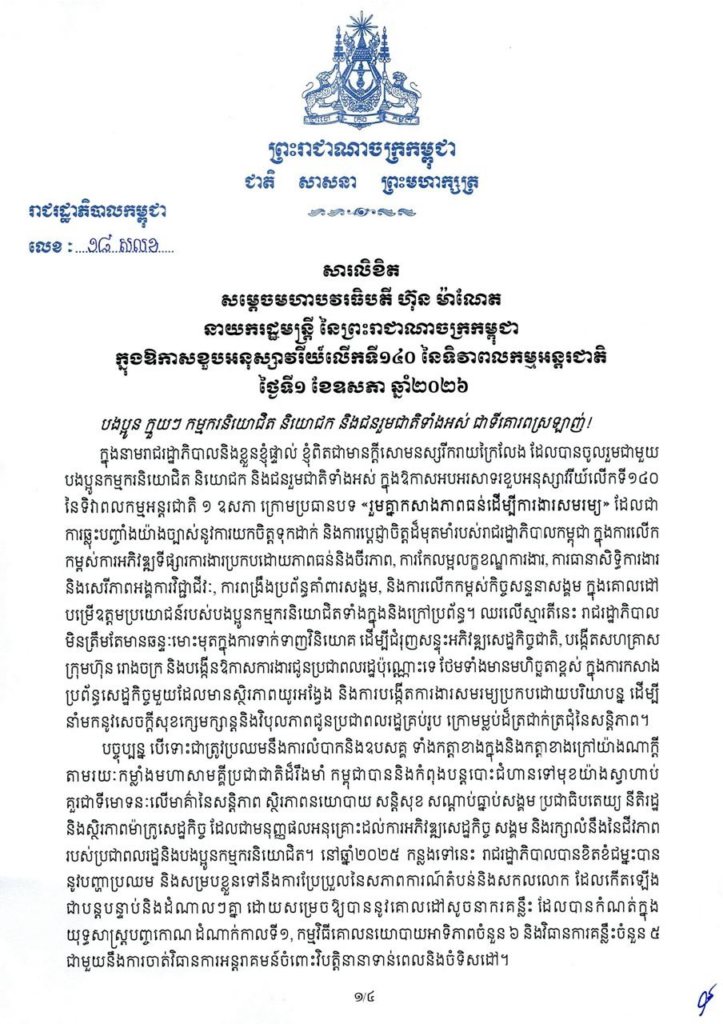 រដ្ឋាភិបាលកម្ពុជា បានបង្ហាញការប្តេជ្ញាចិត្តដ៏មុតមាំរបស់រាជរដ្ឋាភិបាលកម្ពុជា ក្នុងការលើក កម្ពស់ការអភិវឌ្ឍទីផ្សារការងារនៅកម្ពុជា ប្រកបដោយភាពធន់និងចីរភាព។ នេះបើយោងតាមសារលិខិតសម្តេចធិបតី ហ៊ុន ម៉ាណែត នាយករដ្ឋមន្ត្រី នៃព្រះរាជាណាចក្រកម្ពុជា ក្នុងឱកាសខួបអនុស្សាវរីយ៍លើកទី១៤០ នៃទិវាពលកម្មអន្តរជាតិ ថ្ងៃទី១ ខែឧសភា ឆ្នាំ២០២៦។
