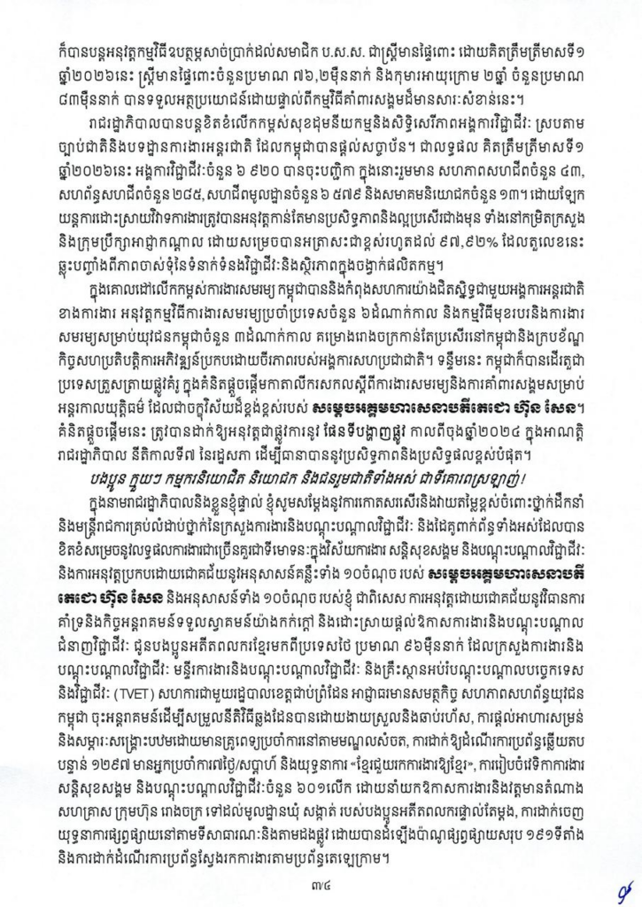 សម្តេចធិបតី បន្តថា តាមរយៈទិវានេះ គឺបានបង្ហាញពីការឆ្លុះបញ្ចាំងយ៉ាងច្បាស់នូវការយកចិត្តទុកដាក់ និងការប្តេជ្ញាចិត្តដ៏មុតមាំរបស់រាជរដ្ឋាភិបាលកម្ពុជា ក្នុងការលើក កម្ពស់ការអភិវឌ្ឍទីផ្សារការងារប្រកបដោយភាពធន់និងចីរភាព, ការកែលម្អលក្ខខណ្ឌការងារ, ការធានាសិទ្ធិការងារ និងសេរីភាពអង្គការវិជ្ជាជីវៈ, ការពង្រឹងប្រព័ន្ធគាំពារសង្គម, និងការលើកកម្ពស់កិច្ចសន្ទនាសង្គម ក្នុងគោលដៅ បម្រើឧត្តមប្រយោជន៍របស់បងប្អូនកម្មករនិយោជិតទាំងក្នុងនិងក្រៅប្រព័ន្ធ។