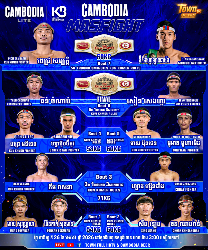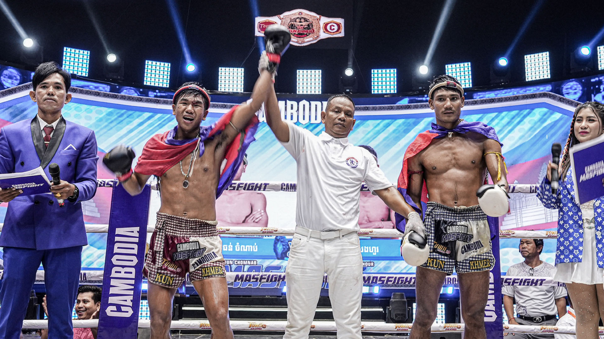 រាជធានីភ្នំពេញ៖ អស់រយៈពេលជាច្រើនសប្តាហ៍ កម្មវិធី Mas Fight បានឈានមកដល់វគ្គផ្តាច់ព្រ័ត្រ ដោយគូប្រកួតចុងក្រោយគឺ ធន់ ចំណាប់ បានយកជ័យជំនះជាមួយនឹង ខ្សែក្រវាត់លំដាប់ពិភពលោក IPCC គុនខ្មែរ និងទឹកប្រាក់ចំនួន ៤០ លានរៀល ក្រោមការឧបត្ថម្ភពីក្រុមហ៊ុន ខ្មែរ ប៊ែវើរីជីស។ ចំណែកជើងឯករង សៀង សេងហួរ ទទួលបានការឧបត្ថម្ភទឹកប្រាក់ចំនួន ២០ លានរៀល នៅក្នុងការប្រកួត Cambodia Mas Fight ផងដែរ។