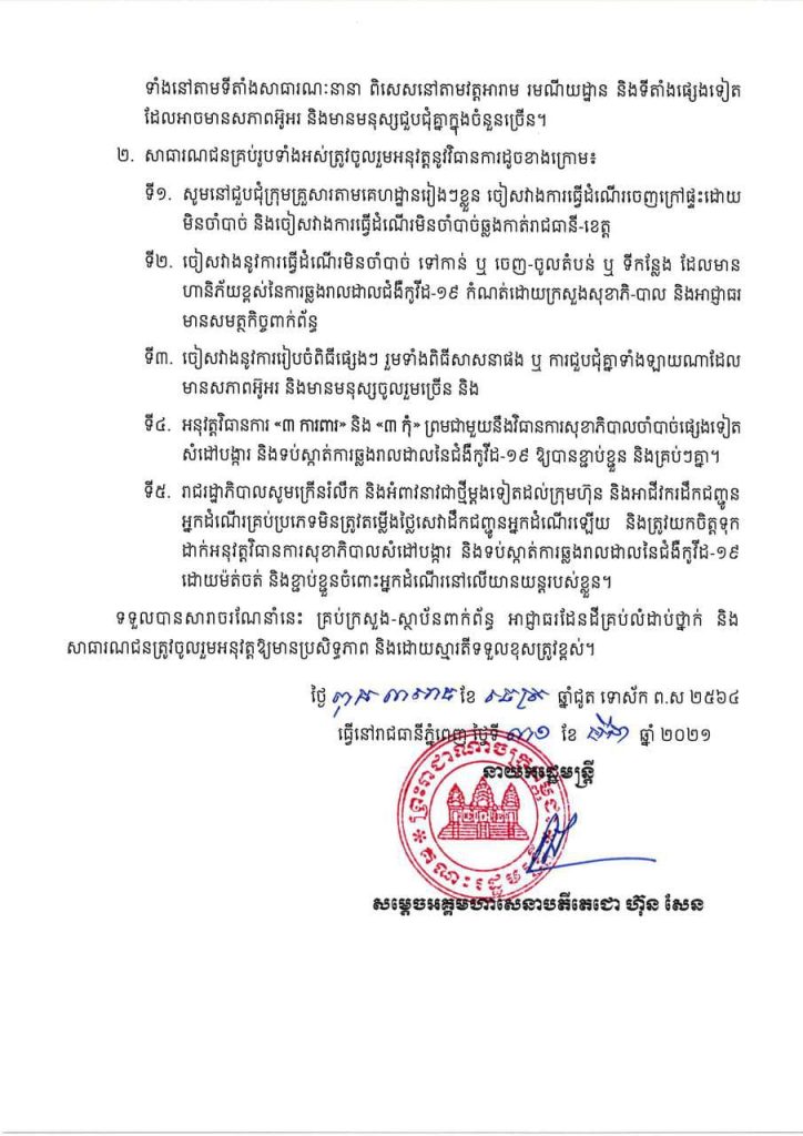 រាជរដ្ឋាភិបាលកម្ពុជា ទើបចេញសារាចរណែនាំមួយ ស្ដីពីវិធានការបង្ការ និងទប់ស្កាត់ ការរាតត្បាតនៃជំងឺកូវីដ-១៩ នៅក្នុងឱកាសឈប់សម្រាកក្នុងពិធីបុណ្យចូលឆ្នាំខ្មែរប្រពៃណីជាតិ ដែលត្រូវនឹងថ្ងៃទី ១៤ ដល់ថ្ងៃទី ១៦ មេសា ឆ្នាំ២០២១។ ខ្លឹមសារនៃសារាចរណែនាំដ៏ម៉ឹងម៉ាត់នោះ មានខ្លឹមសារដូចខាងក្រោម៖