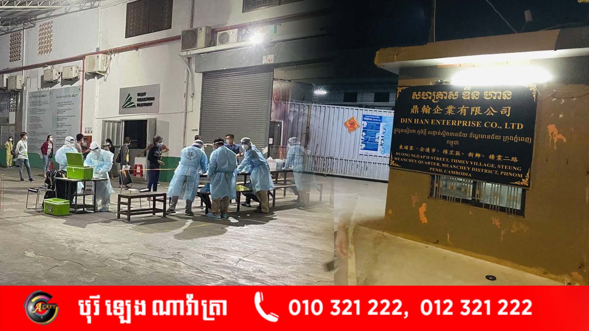 រោងចក្រកាត់​ដេរ​ «​ឌី​ន ហាន​» នៅខណ្ឌមានជ័យ​ បាន​រក​ឃើញ​អ្នក​ឆ្លង​ជំងឺ​កូ​វីដ​ជិត​៥០​នាក់ អាជ្ញាធរ​អំពាវនាវ​ឲ្យ​កម្មករ​ទាំងអស់ ដាច់​ខាត​ត្រូវ​មក​ធ្វើ​តេស្ត​ជាបន្ទាន់​នៅ​ថ្ងៃនេះនៅរោចក្រ​តែម្តង បើមិនដូច្នេះ​ទេមិន​អនុញ្ញាត​ឲ្យ​ចូល​ធ្វើ​ការ​ឡើយ នេះ​បើ​តាម​ប្រសាសន៍​របស់​លោក​ឃួង ស្រេង អភិបាល​រាជធានីភ្នំពេញ​។