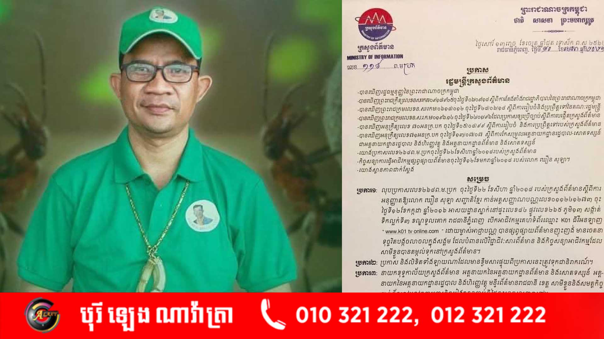 រដ្ឋមន្ដ្រីក្រសួងព័ត៌មាន ឯកឧត្តម ខៀវ កាញារីទ្ធ បានសម្រេចលុបអាជ្ញាធរគេហទំព័រឈ្មោះ K01 ធីវីអនឡាញ របស់លោក ឃឿន សូឡា ហៅលោកK01 ដោយហេតុផលម្ចាស់អាជ្ញាបណ្ណបានផ្សព្វផ្សាយ ព័ត៌មានញុះញង់ មានចេតនាទុច្ចរិតបង្កចលាចលក្នុងសង្គម ដែលបំពានលើវិជ្ជាជីវៈសារព័ត៌មាន និងកិច្ចសន្យាអាជីវកម្ម។