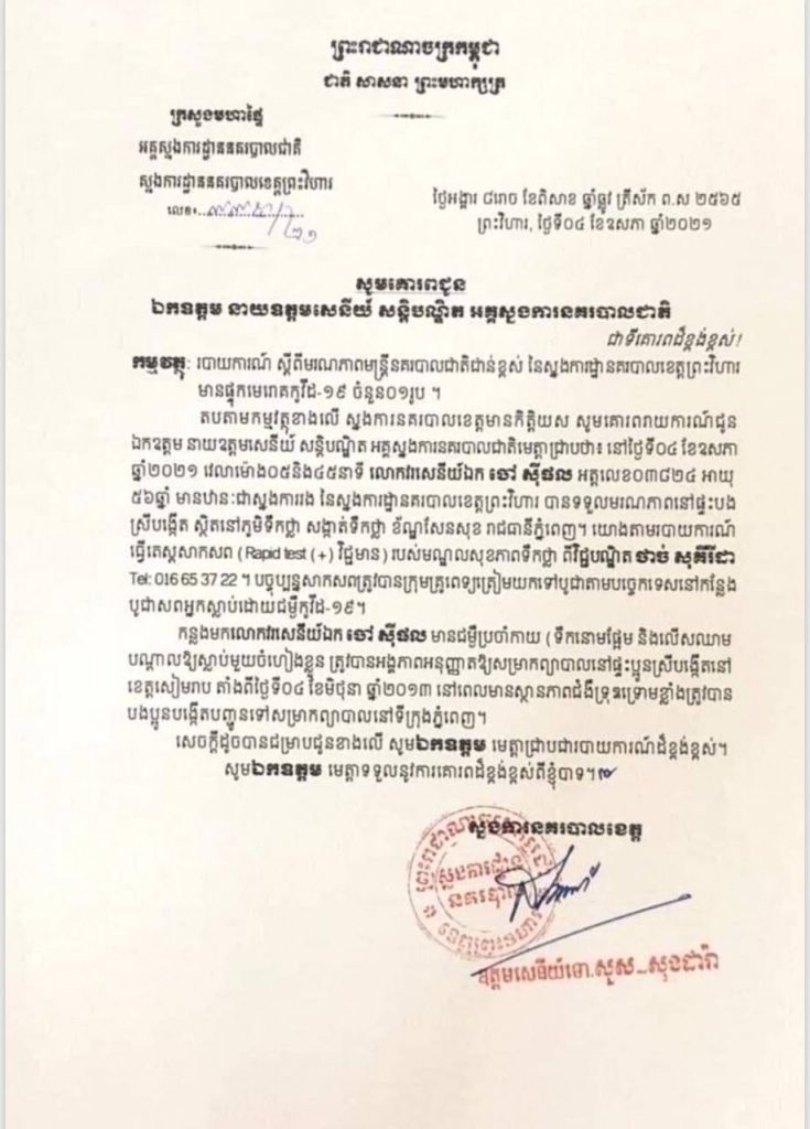បើតាមសេចក្តីរាយការណ៍របស់លោកឧត្តមសេនីយ៍ទោ សួស សុខដារ៉ា ស្នងការនគរបាលខេត្តព្រះវិហារបានបញ្ជាក់ ថា មន្រ្តីនរគបាលជាន់ខ្ពស់ដែលស្លាប់ដោយសារកូវីដគឺលោក វរសេនីយឯក ចៅ សុផល ជាស្នងការរងនគរបាលខេត្តព្រះវិហារ។