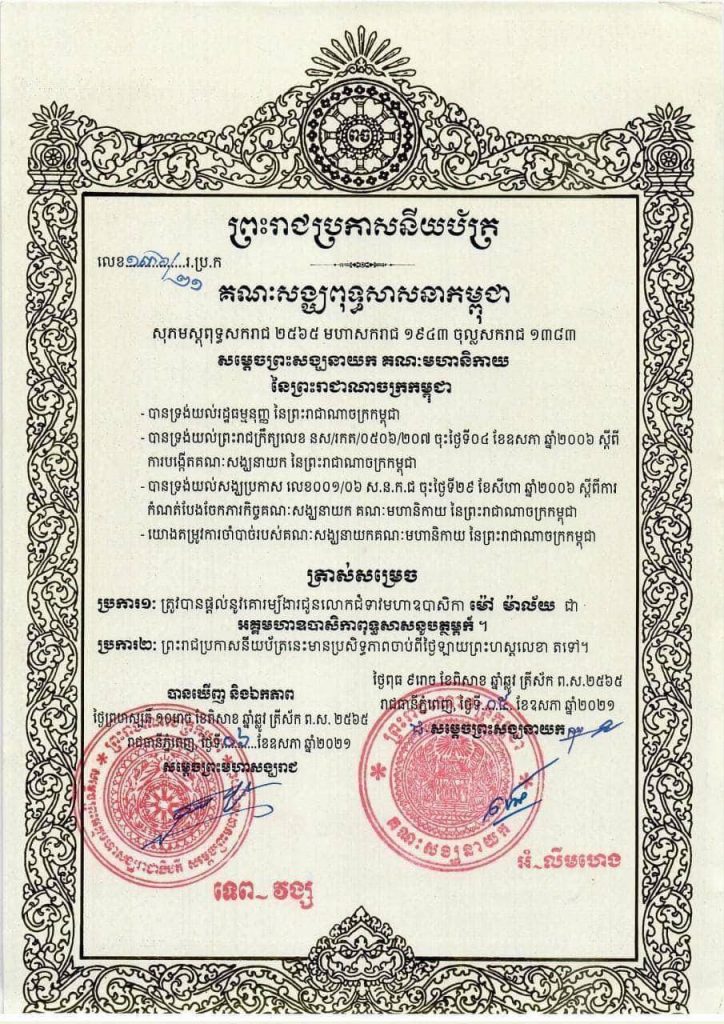 លោកជំទាវ ម៉ៅ ម៉ាល័យ កែ គឹមយ៉ាន ត្រូវបានគណៈសង្ឃពុទ្ធសាសនាកម្ពុជា ត្រាស់សម្រេចផ្តល់គោរម្យងារជា “អគ្គមហាឧបាសិកាពុទ្ធសាសនូបត្ថម្ភក៍” កាលពីថ្ងៃទី៦ ខែឧសភា ឆ្នាំ២០២១ ។