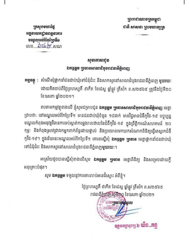 ក្រោយមានជនជាប់ឃុំចំនួន ១៨នាក់ផ្ទុកជំងឺឆ្លងកូវីដ១៩ មណ្ឌលអប់រំកែប្រែទី១ ស្នើទៅប្រធានសាលាដំបូងរាជធានីភ្នំពេញ ដើម្បីសុំផ្អាកនាំជនជាប់ឃុំទៅជំនុំជំរះ និងសាកសួរនៅសាលាតំបូងរាជធានីភ្នំពេញមួួយរយៈដោយគិតចាប់ពីថ្ងៃទី២០ ខែឧសភា ឆ្នាំ២០២១។