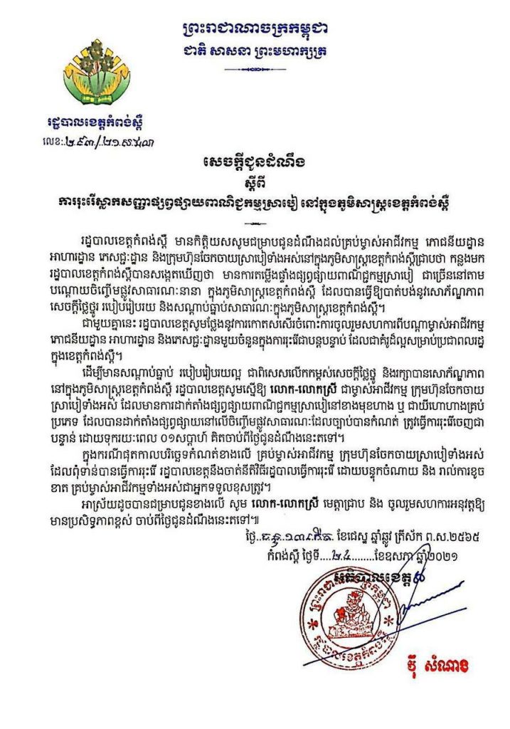 នេះបើយោងតាមលិខិតជូនដំណឹងរបស់រដ្ឋបាលខេត្តកំពង់ស្ពឺ ចេញផ្សាយនៅថ្ងៃទី២៤ ខែឧសភា ឆ្នាំ២០២១នេះ។