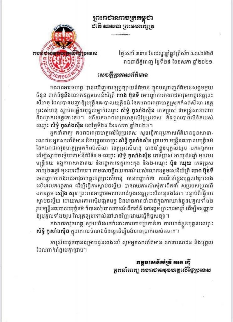សេចក្តីប្រកាសព័ត៌មានខាងលើ បានបញ្ជាក់ មន្ត្រីនគរបាលយុត្តិធម៌ នៃកងរាជអាវុធហត្ថស្រុកកំពង់សីលា ខេត្តព្រះសីហនុ បាននាំខ្លួនបុគ្គល ២រូប មកអង្គភាពដើម្បីស្តាប់ចម្លើយតាមនីតិវិធី គឺទី១៖ ឈ្មោះ សិទ្ធិ កូសាំងស៊ីន ភេទប្រុស អាយុ៥៨ឆ្នាំ មុខរបរមន្ត្រីគយ អង្គភាពសាខាគយ និងរដ្ឋាករខេត្តកោះកុង និង២៖ ឈ្មោះ ប៉ុន ឈុយ ភេទប្រុស អាយុ២៣ឆ្នាំ មុខរបរបើកបរ។