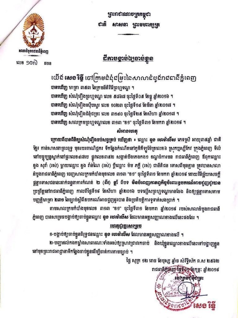 ដោយសារអំណាចនៃសាលក្រមនេះចូលជាស្ថាពរទើបកាលពីថ្ងៃទី ០២កុម្ភៈ ឆ្នាំ២០១៩ លោកចៅក្រម សេង រិទ្ធី បានចេញដីកាបង្គាប់អោយសមត្ថកិច្ចសាធារណៈចាប់ខ្លួនពិរុទ្ធជនឈ្មោះ ឌួង ហេម៉ាលីស យកមកអនុវត្តតាមសេចក្ដីសម្រេចរបស់តុលាការ ហើយនៅថ្ងៃទី ០២មិថុនា ឆ្នាំ២០២១នេះ នគរបាលបានចាប់ខ្លួនជនត្រូវចោទមកប្រគល់អោយតុលាការតែម្ដង៕