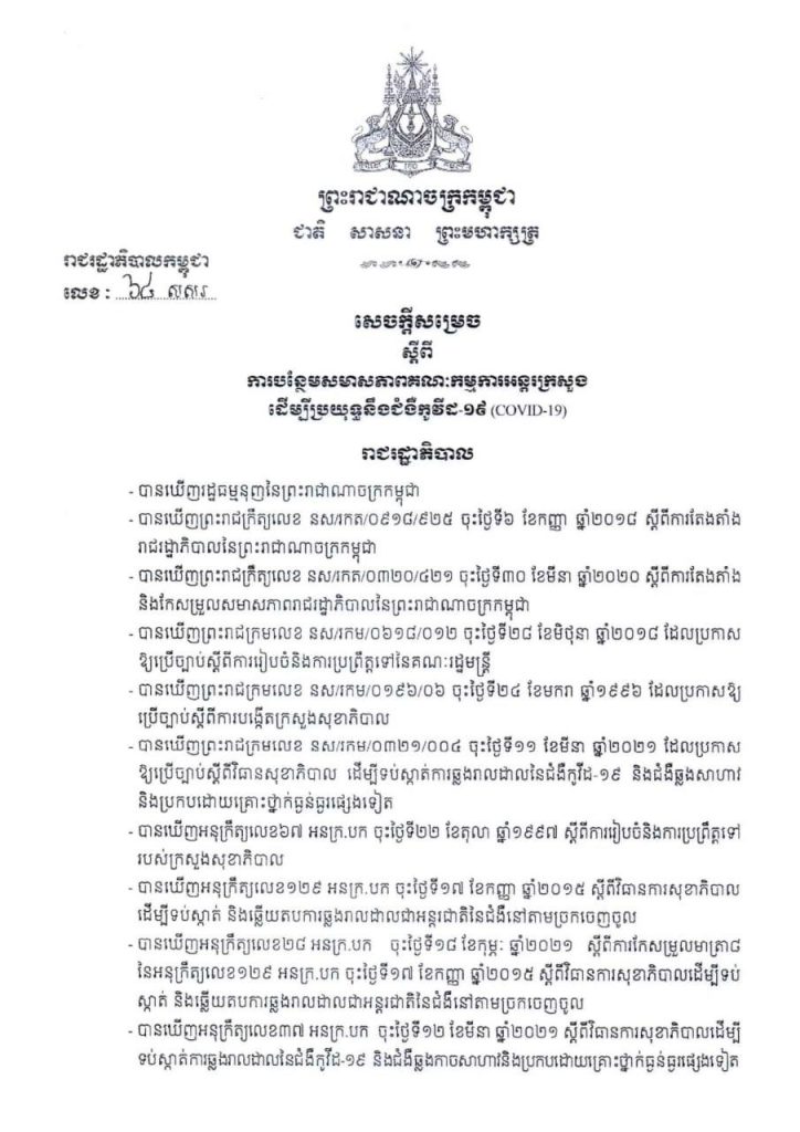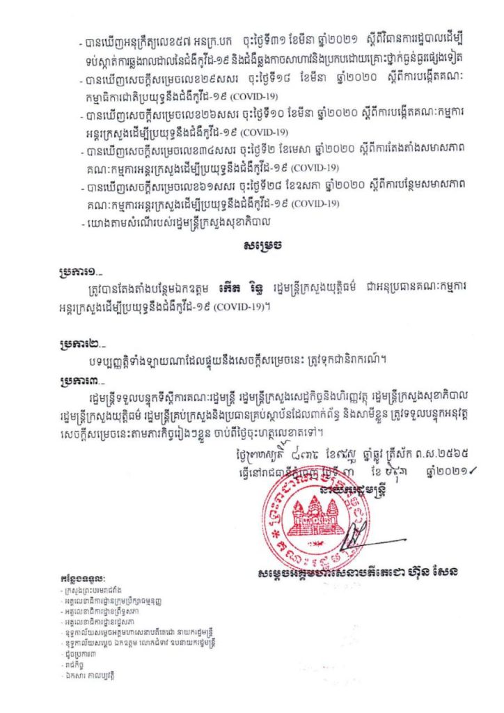 រាជរដ្ឋាភិបាលកម្ពុជា បន្ថែមសមាសសភាពគណៈកម្មការអន្តរក្រសួងដើម្បីប្រយុទ្ធនឹងជំងឺកូវីដ១៩ ហើយសម្រេចតែងតាំងលោក កើត រិទ្ធ រដ្ឋមន្ត្រីក្រសួងយុត្តិធម៌ ជាអនុប្រធានគណៈកម្មការអន្តរក្រសួងប្រយុទ្ធនឹងកូវីដ-១៩។
