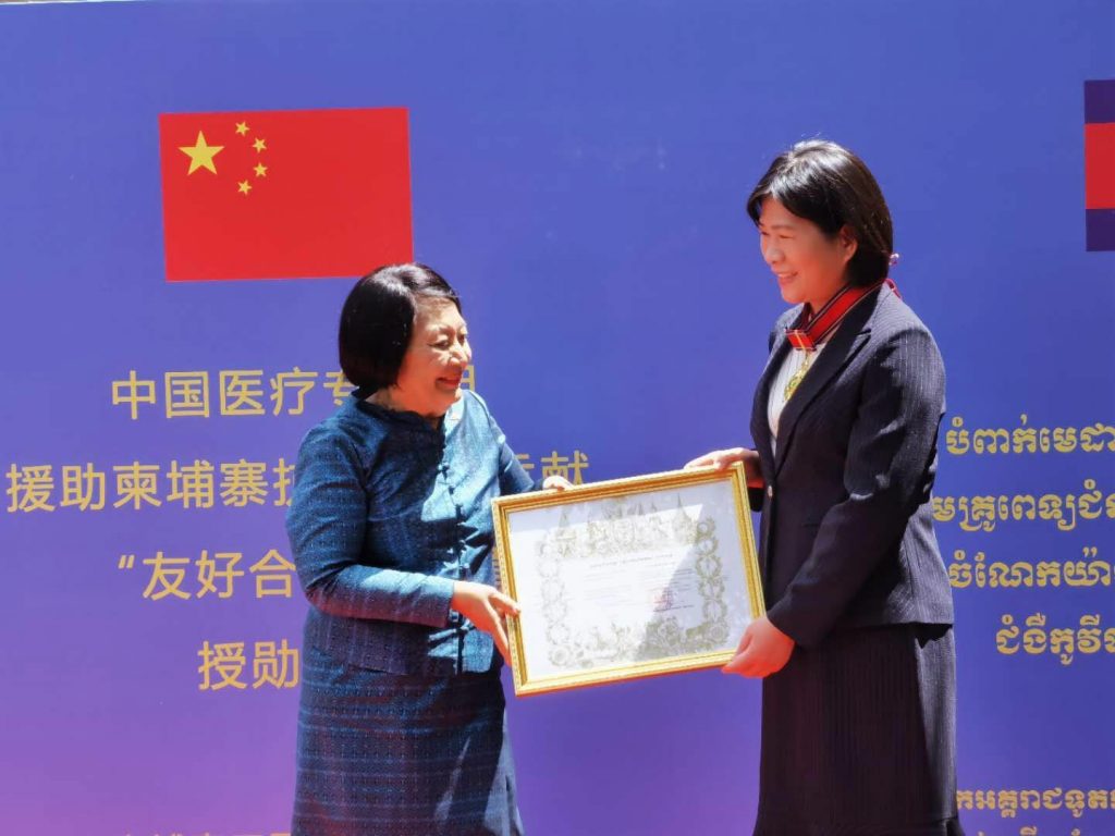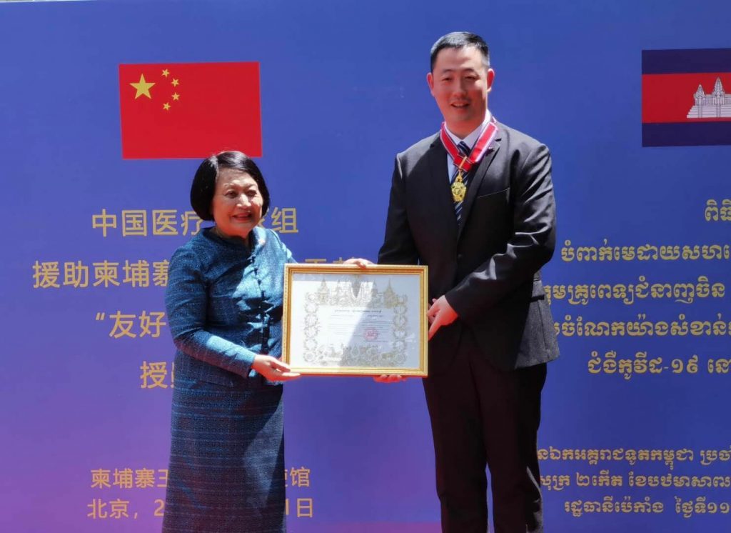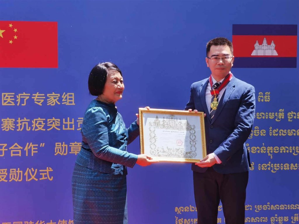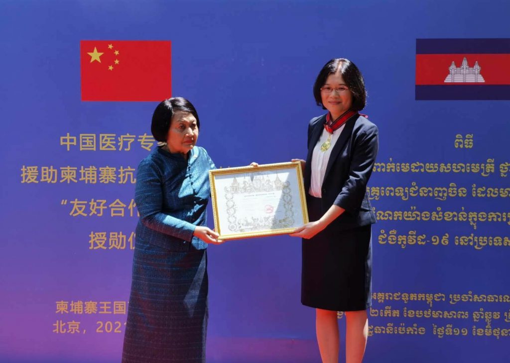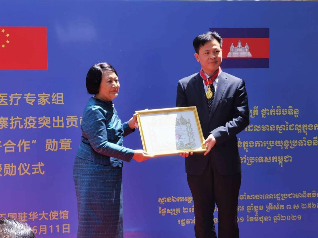 កម្ពុជា បំពាក់មេដាយសហមេត្រីថ្នាក់ធិបឌិន្ទជូនដល់ក្រុមអ្នកជំនាញវេជ្ជសាស្រ្តចិន ចំនួន ៧រូប ក្នុងកិច្ចទប់ស្កាត់នឹងជំងឺវីរុសកូវីដ-១៩ នៅថ្ងៃទី១១ ខែមិថុនានេះ ដែលរៀបចំឡើងក្នុងរដ្ឋធានីប៉េកាំង ប្រទេសចិន។