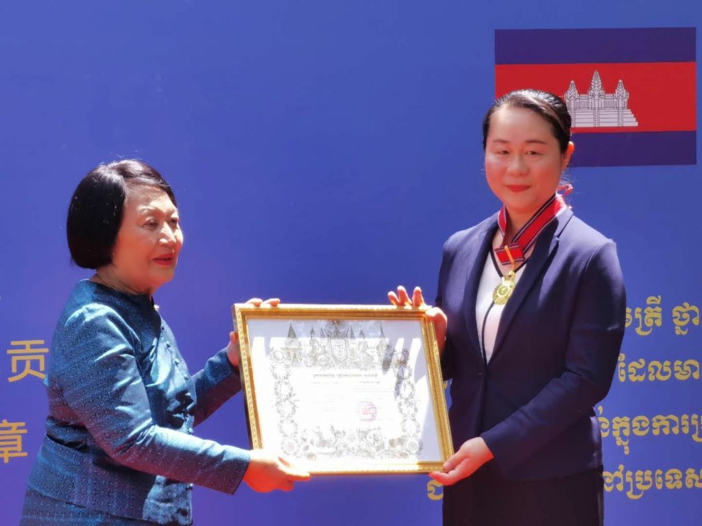 លោកជំទាវ ខែក កែមាលី ស៊ីសូដា ឯកអគ្គរាជទូតកម្ពុជាប្រចាំសាធារណរដ្ឋប្រជាមានិតចិន តំណាងឱ្យរាជរដ្ឋាភិបាលកម្ពុជា បានបំពាក់មេដាយសហមេត្រីថ្នាក់ធិបឌិន្ទជូនដល់លោក Ai Xiang និងក្រុមអ្នកជំនាញវេជ្ជសាស្រ្តចិនផ្សេងទៀតសរុប៧រូប ដែលអញ្ជើញមកពីតំបន់ស្វយ័ត Guangxi ដែលពួកគាត់បានរួមចំណែកយ៉ាងសកម្មក្នុងកិច្ចទប់ស្កាត់លើជំងឺវីរុសកូវីដ-១៩នៅក្នុងប្រទេសកម្ពុជា។