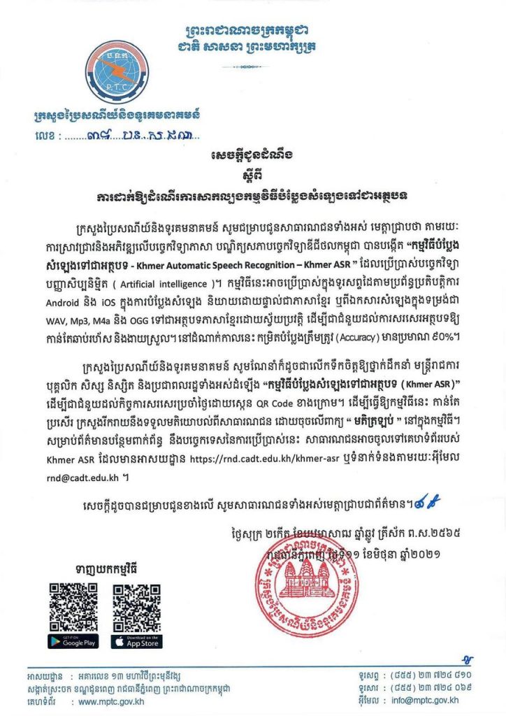 ក្រសួងប្រៃសណីយ៍ និងទូរគមនាគមន៍ ប្រកាសដាក់ឱ្យដំណើរការសាកល្បងកម្មវិធីបំប្លែងសំឡេងភាសាខ្មែរ ទៅជាអត្ថបទ ដែលប្រើប្រាស់សញ្ញាសិប្បនិមិត្ត Artificail intelligence។