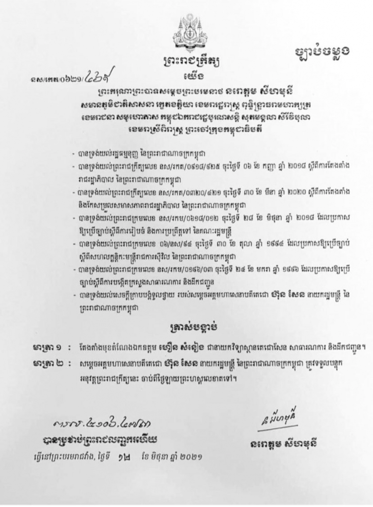 លោក ហឿន សំនៀង អគ្គនាយករង នៃអគ្គនាយកដ្ឋានរដ្ឋបាលហិរញ្ញវត្ថុ និងជាជំនួយការផ្ទាល់ឯកឧត្តមទេសរដ្ឋមន្រ្តី ស៊ុន ចាន់ថុល រដ្ឋមន្រ្តីក្រសួងសាធារណការ និងដឹកជញ្ជូន ត្រូវបានព្រះមហាក្សត្រតែងតាំងជានាយកវិទ្យាស្ថានតេជោសែន សាធារណការ និងដឹកជញ្ជូន តាមព្រះរាជក្រឹត្យ នស/រកត/០៦២១/៤៦៩ ចុះថ្ងៃទី១២ ខែមិថុនា ឆ្នាំ២០២១នេះ។