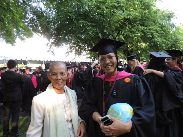 លោក ហឿន សំនៀង បានបញ្ចប់ការសិក្សាថ្នាក់បរិញ្ញាបត្រជាន់ជាន់ខ្ពស់ជំនាញរដ្ឋបាលសាធារណ: ពីសកលវិទ្យាល័យហាវឺដ (Harvard University, Kennedy School of Governemnt 2013) សហរដ្ឋអាមេរិក និងបរិញ្ញាបត្រជំនាញគ្រប់គ្រងពីសាកលវិទ្យាល័យសិនអែមប្រុស (St. Ambrose University) រដ្ឋអាយូវ៉ា សហរដ្ឋអាមេរិក។ កាលនោះ លោកនៅជាព្រះសង្ឃនៅឡើយ។