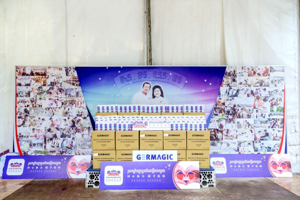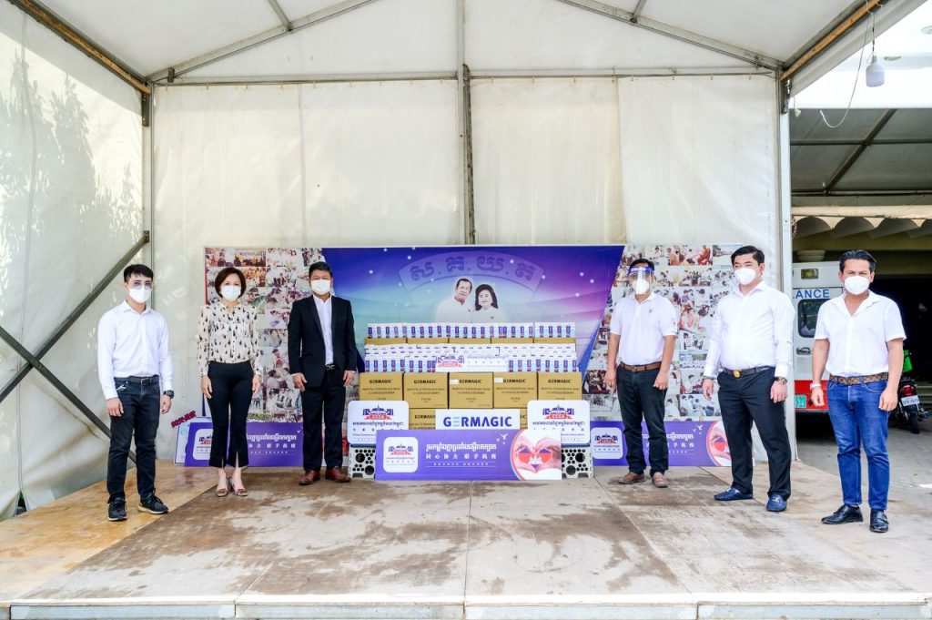 សមាគមពាណិជ្ជកម្មចិននៅកម្ពុជា នាំយកផលិតផល GERMAGIC ទឹកថ្នាំបាញ់សម្លាប់មេរោគបែបឆ្លាតវៃ ចំនួន ៣១៥០ដប គិតជាទឹកប្រាក់ជាង ២ម៉ឺនដុល្លារ ជូនក្រុមគ្រូពេទ្យយុវជនស្មគ្រ័ចិត្តសម្ដេចតេជោ